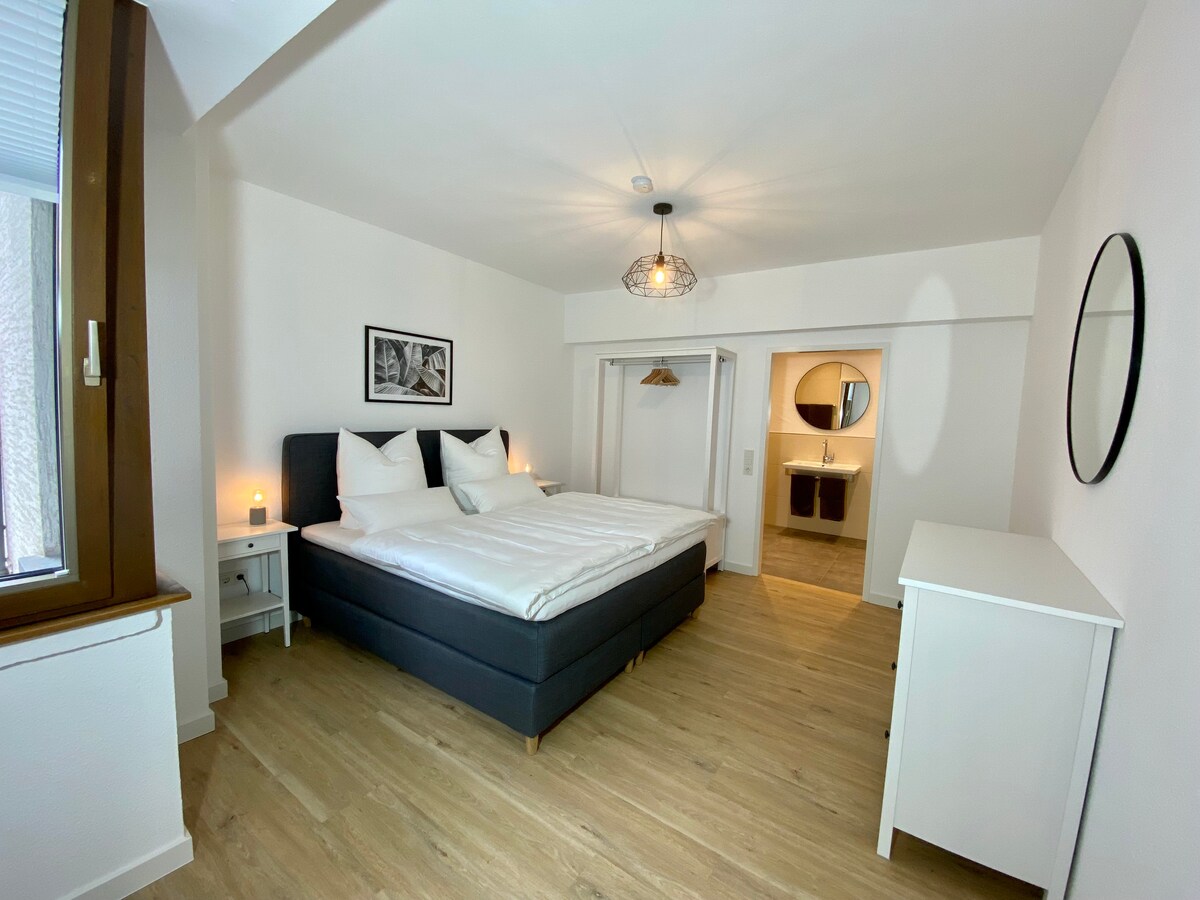 Flat studio moden, cerah dan selesa di bangunan baru (2020). Flat studio mewah 43 meter persegi kami "FEWO 88" terletak di sisi Traben Traben-Trarbach di sepanjang tebing sungai Mosel. Ia mempunyai dapur yang lengkap, mesin basuh/pengering, penyaman udara, pemanas lantai, sistem pengudaraan, WiFi, TV Pintar, katil boxspring bersaiz king, katil sofa, pemandangan sungai, dan lif. Flat ini mempunyai ruang letak kereta yang ditetapkan. Bangunan berbilang keluarga ini benar-benar bebas halangan dari tempat letak kereta ke flat.