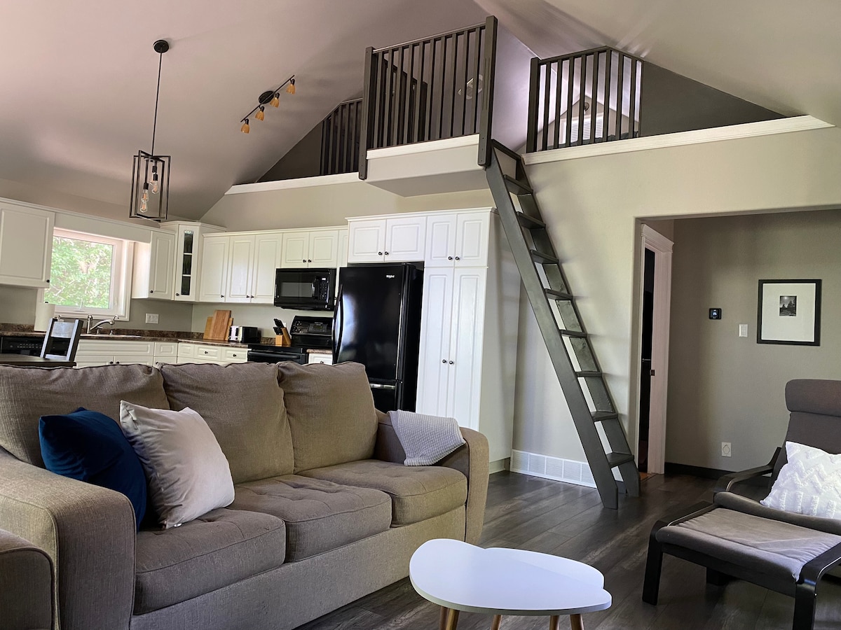 Ini ialah loteng di atas garaj berganda. Ia terletak 13 langkah ke loteng yang persendirian, luas dan selesa. Bilik air yang baru diubahsuai yang termasuk tandas, sinki dan pancuran mandi. Loteng ini dilengkapi dengan tv satelit, peti sejuk mini, ketuhar gelombang mikro, Keurig, bbq, dispenser air, haba dan penyaman udara. Terdapat trampolin, lubang api dan kayu serta meja ping pong di garaj. Kawasan yang tenang. Ia adalah 3 km ke pantai di tapak bandar Wasagaming yang berada di Taman Negara Riding Mountain yang indah.
