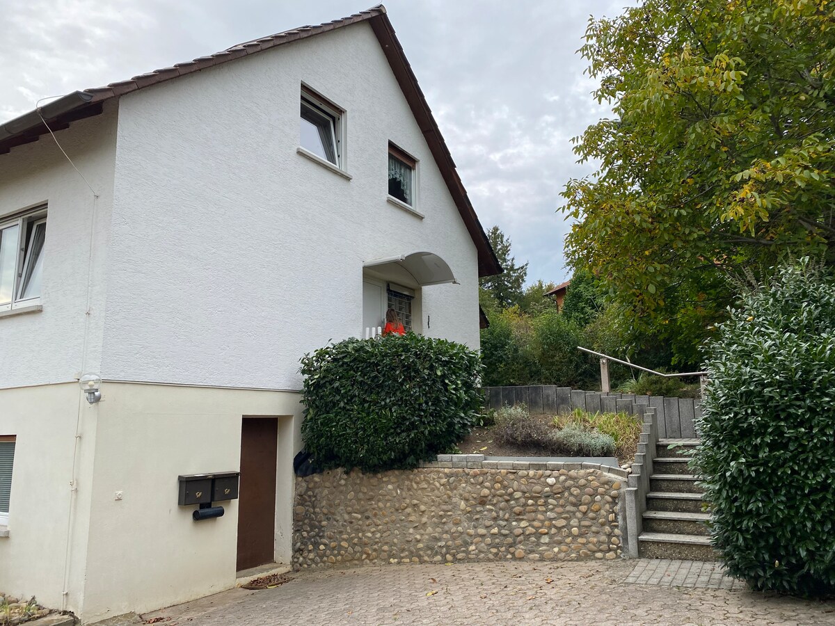 Liebe Gäste, bei uns erwartet Sie eine 2020 geschaffene und modern eingerichtete 1 1/2 Zimmer große Ferienwohnung, inkl. eines eigenen Eingangs. Sie besitzt ein separates Bad sowie eine eigene Küche. Zur Verfügung stehen Ihnen außerdem ein großzügig gestalteter Außensitzbereich, ein abschließbarer Fahrradunterstand, sowie 2 KFZ Stellplätze direkt am Haus. Wunderschön zwischen Weinbergen, gegen Ende einer Sackgasse gelegen, können Sie hier in Ruhe Ihren Urlaub genießen.