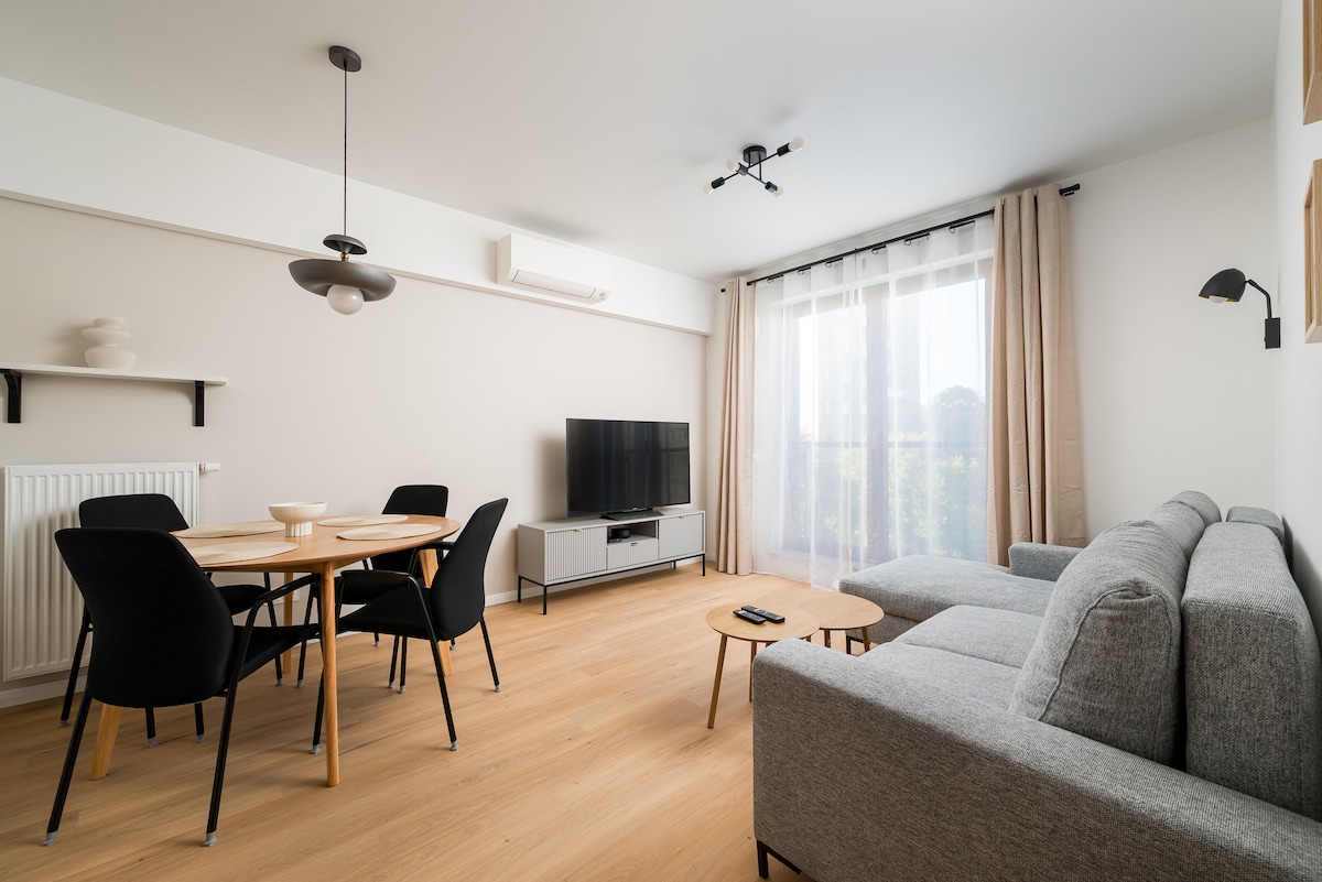 Apartmen 1 bilik di bangunan kecil baru dengan garaj bawah tanah. Apartmen ini baru dihias, dilengkapkan dengan standard yang tinggi - berperabot dan dilengkapi dengan peralatan rumah baru dan TV. Kelebihan utama apartmen ini ialah lokasinya - berhampiran Lapangan Terbang Chopin, patio yang tergolong dalam apartmen (kira-kira 40-50 m2 !!!) dan garaj bawah tanah. Apartmen ini mempunyai hubungan yang baik dengan pusat bandar Warsaw - tersedia dengan laluan trem 7 dan 9. 7.7 km ke pusat bandar Warsaw (Stesen Kereta Api Warsaw Central).