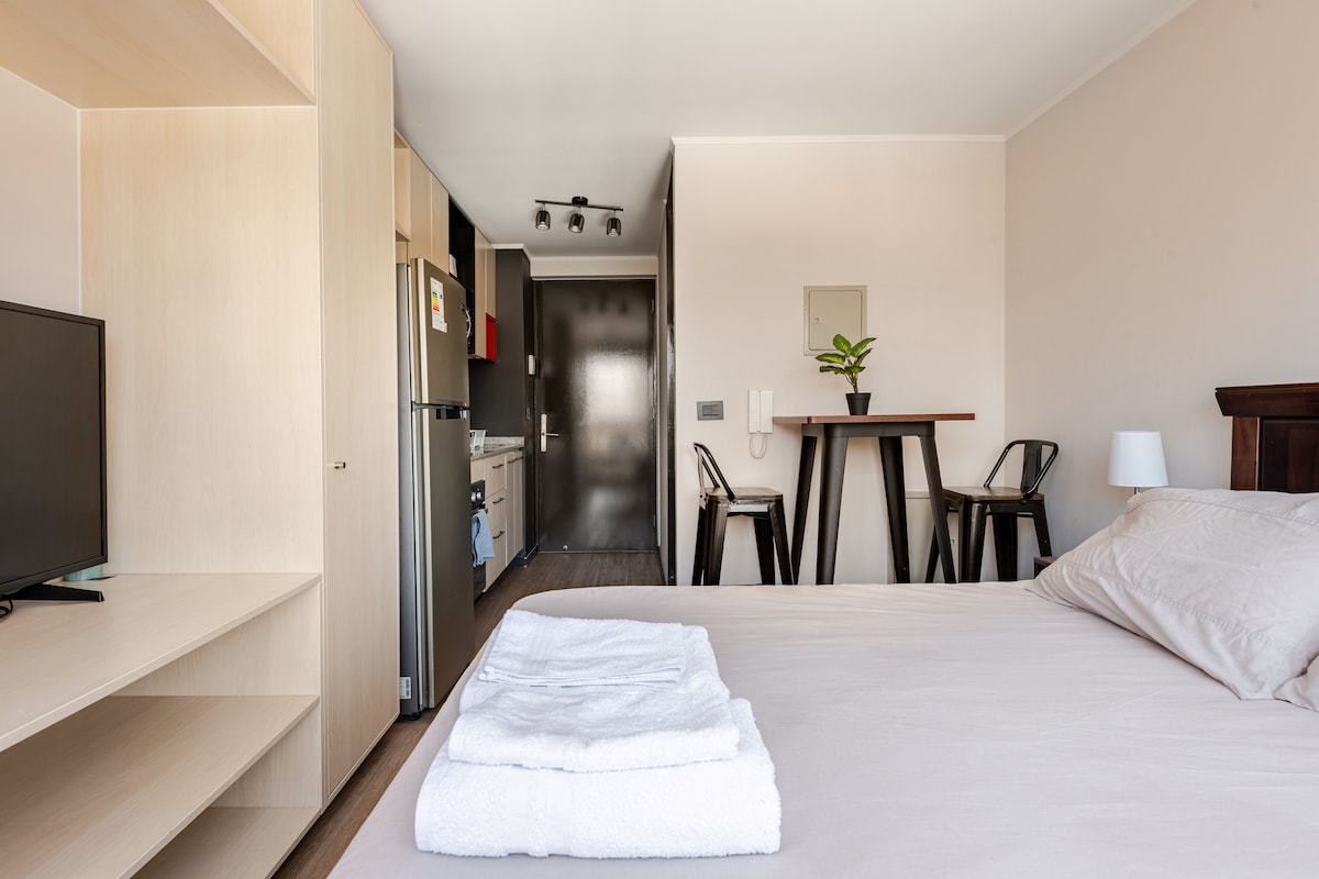 Apto moden dan selesa di Santiago Centro - Sesuai untuk Meneroka Bandar ✨ 👉Berperabot lengkap dan serba lengkap, sesuai untuk penginapan jangka pendek atau panjang. 👉Wi-Fi berkelajuan tinggi, sesuai untuk kerja jarak jauh. 50¨ 👉Smart TV dengan akses kepada platform penstriman. 👉Akses kepada kawasan awam berkongsi seperti kolam renang, ruang tamu dan dua quinchos. 👉Pegas kotak yang selesa dengan peralatan tempat tidur berkualiti hotel yang lembut dan sangat baik. 👉Bilik mandi moden dengan tekanan air panas dan sejuk yang baik.