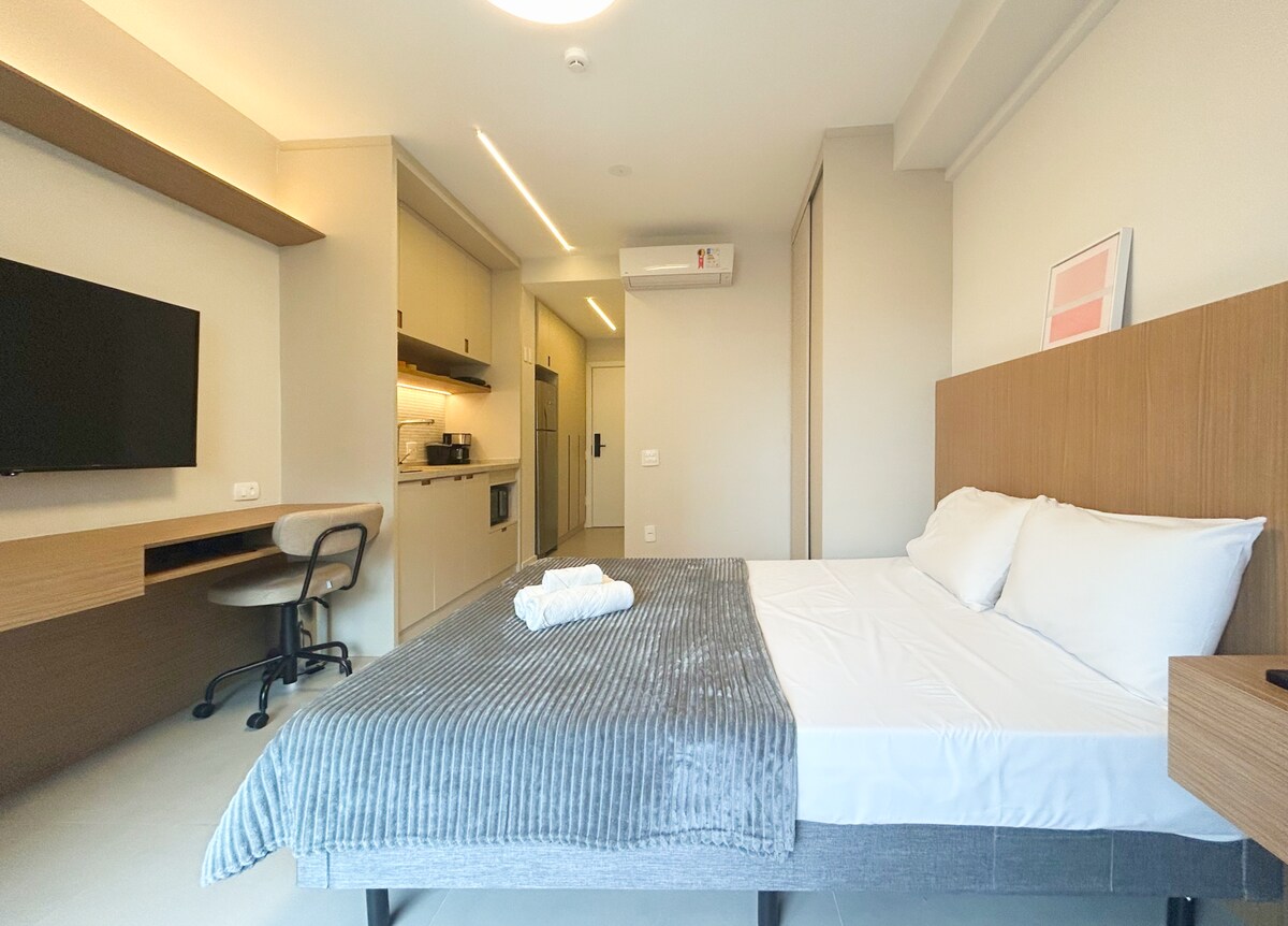Studio baharu lengkap dengan semua struktur yang anda perlukan untuk tinggal selama yang diperlukan. Tilam Simmons (sama digunakan di Disney Resorts) dan pilihan untuk katil kelamin atau dua katil bujang (kedua-duanya saiz King). Persekitaran yang selesa, moden, dan berfungsi, bersebelahan stesen kereta api bawah tanah Faria Lima dan dengan infrastruktur yang lengkap di kawasan ini! Bangunan dengan kolam renang, dobi, bilik mesyuarat, kerja bersama, gimnasium, barbeku, dan bilik parti, semuanya tersedia untuk tetamu!