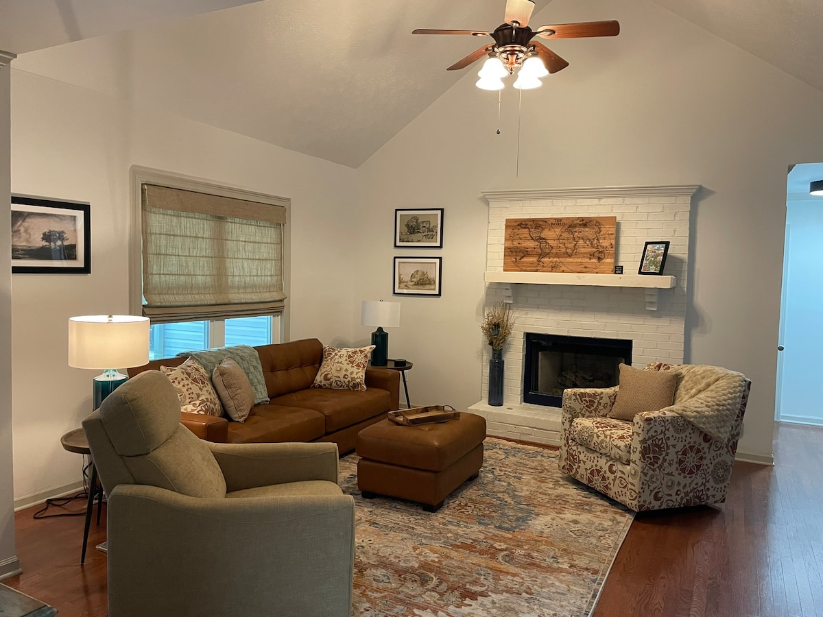 NEW FLOORING, new area rugs in each bedroom. Fresh trim around windows & doors including baseboards. Our home is fully furnished with all the comforts of home. All bedrooms are upstairs with 2 full baths. Laundry is also upstairs. Kitchen fully equipped. Our home is in a lovely quiet neighborhood. Close to shopping, restaurant and outdoor trails for biking, running, walking and golf carting. All surfaces are sprayed & sanitized. All bedding, including comforters are freshly washed.