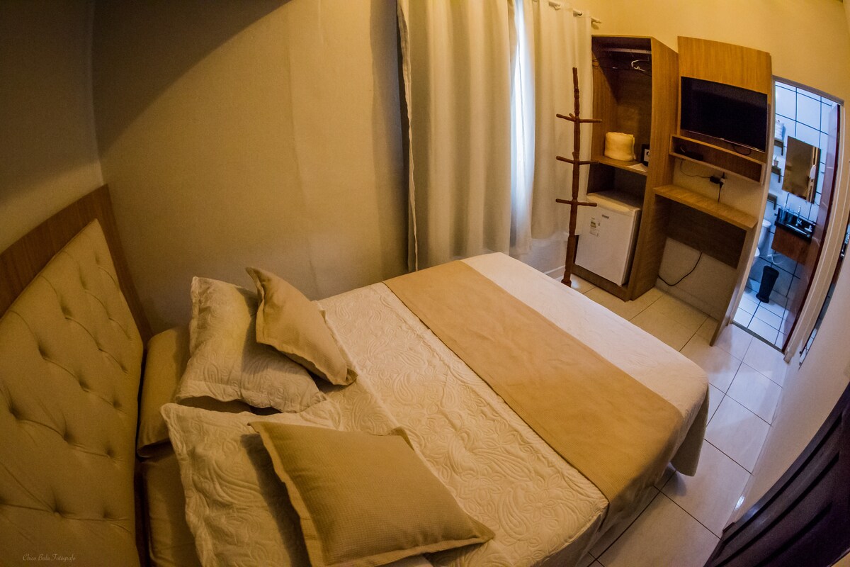Suítes individuais com TV LCD 32", ar condicionado, frigobar, enxoval 300 fios e cortina blackout.