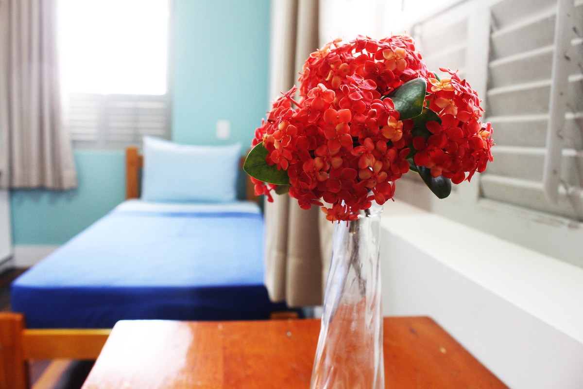 Bilik standard dengan satu katil double dan satu katil single. pendingin hawa tv kabel frigobar bilik mandi peribadi pengering rambut wifi percuma Termasuk sarapan dihidangkan dari 7:30 pagi hingga 10:00 pagi, perkhidmatan pembantu rumah. Kami berada dua blok (300 meter) dari pantai Tengah Balneário Camboriú. Lokasi yang hebat. Akses ke bilik melalui tangga. Kami tiada lif. Tempat letak kereta tertutup dan tertutup ( 24 jam) 90 meter jauhnya pada kos R$ 40.00 bagi setiap kenderaan. tiada tempahan diperlukan.