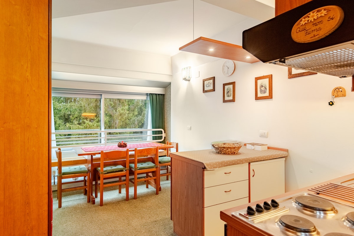 Two-room apartment with a double bedroom with balcony (view of the Brenta Dolomites), bathroom with shower and living area with two sofa beds (for kids or young people), kitchen and a wooden table. Available car parking in the private garden. The kitchen has all the necessary utensils, oven, fridge, freezer and cleaning utensils. Bed linen, sheets, blankets, pillows and hairdryers are also available in the apartment.