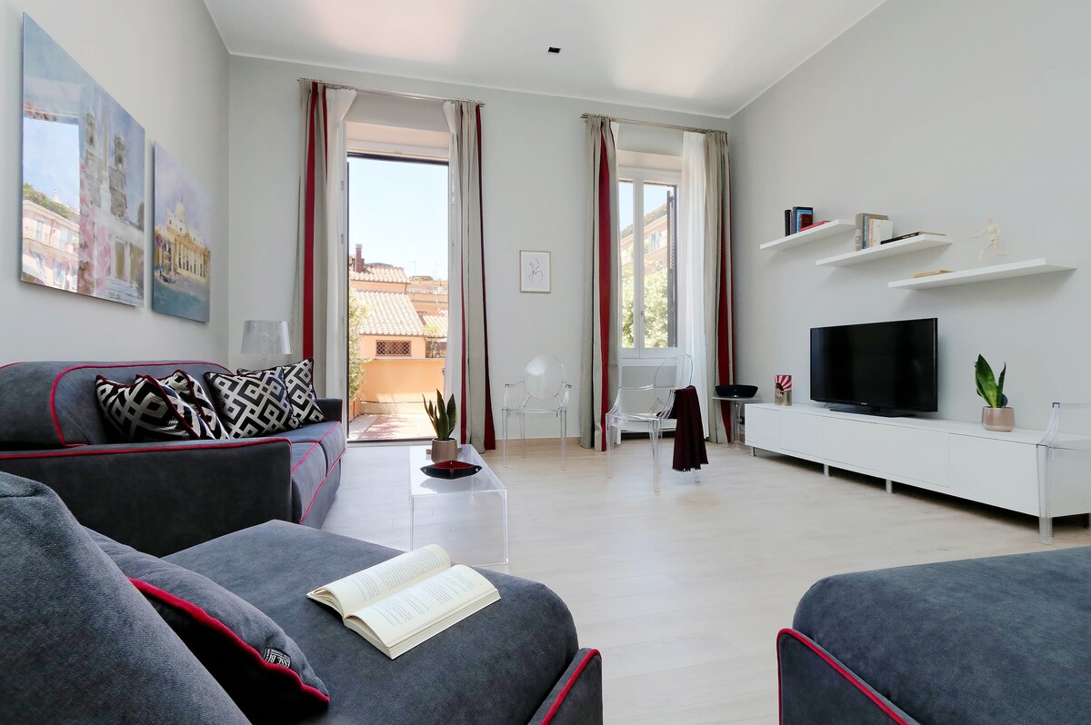 Apartmen pereka bentuk dengan sentuhan hotel Mewah. 3 Bilik Tidur dan 3 bilik mandi dengan teres persendirian dan ruang makan luaran. Mereka yang sukakan kedamaian dan ketenangan tetapi ingin berada di kawasan yang paling eksklusif di Rom, akan mendapati apartmen ini merupakan tempat percutian yang sempurna yang terletak di jalan yang sangat tenang, dikelilingi oleh galeri seni. Pencinta wain akan menghargai pilihan wain peribadi kami yang sedia untuk diminum pada suhu yang betul berkat penyejuk wain khusus di rumah.