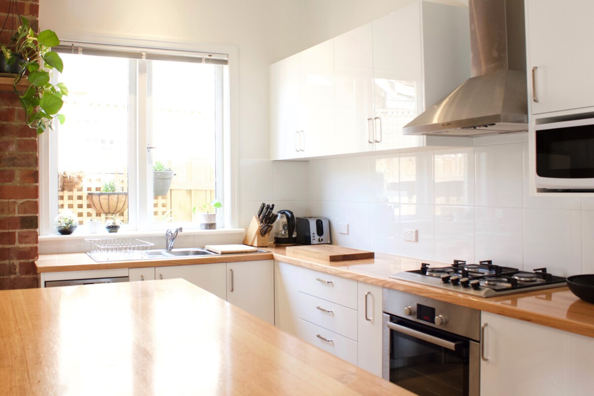 Rumah studio serba lengkap yang dipenuhi cahaya besar. Dihiasi dengan palet scandi-minimalist. Rumah yang dilantik dengan baik ini menawarkan dapur penuh dengan kemudahan memasak induksi, ketuhar konveksi dan semua peralatan untuk menyediakan makanan romantik. Kawasan bilik tidur di bawah siling berkubah tinggi yang dihiasi dengan satu katil queen, tilam mewah dan cadar kapas Mesir, adalah ruang yang santai dan lapang untuk bersantai selepas seharian meneroka. Bilik mandi yang bergaya dan moden yang mempunyai pancuran hujan adalah cara untuk berehat dan menikmati pagi di Melbourne. Tetamu mempunyai akses kepada pintu masuk persendirian dan kawasan halaman mereka dengan suasana taman alfresco untuk berbuka puasa dan berkongsi benang di sebelah taman herba organik kecil. Michele dan saya bersedia untuk sebarang soalan, cerita tinggi dan sebarang cadangan untuk perkara yang boleh dilakukan di Melbourne. Terletak di dalam kawasan hijau dan taman Princes Hill dan Historic Carlton, ia boleh dicapai dengan berjalan kaki singkat ke kampung Rathdown Street dan kedai makan "Little Italy" yang ikonik di Lygon St. Kemudian nikmati filem di Arthouse Cinema Nova tempatan. Kami terletak dalam jarak 5 minit berjalan kaki ke laluan trem menuju ke Bandar, Sydney Road dan Brunswick East dan tempat letak kereta tersedia di sekitar rumah atau hanya berbasikal seperti penduduk tempatan sebenar.