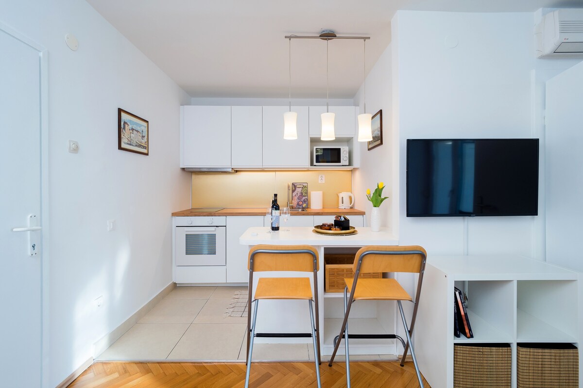 Nikmati pengalaman terbaik bandar lama Split di Riva View Apartment. Terletak sempurna di tengah-tengah Riva di tingkat 1, anda akan menikmati pemandangan indah di pulau-pulau dari balkoni anda. Apartmen ini telah diubah suai sepenuhnya untuk mendedahkan keaslian dinding batu Istana Diocletian dan memberikan keselesaan maksimum semasa penginapan anda. Anda akan menemui tempat letak kereta berbayar awam terdekat hanya beberapa ratus meter dari apartmen dan pelabuhan Feri terletak sejauh 5 minit berjalan kaki.