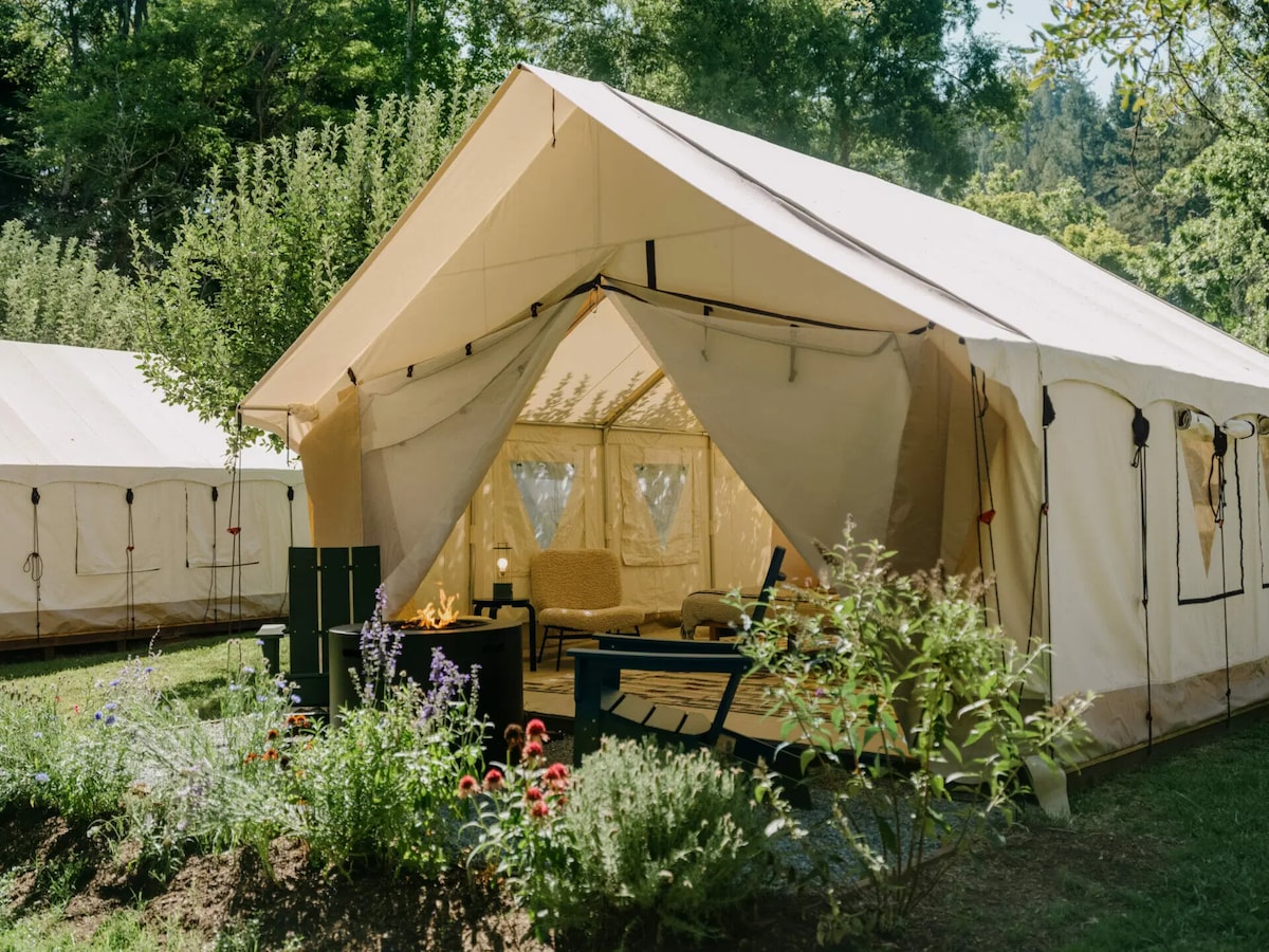 The Deluxe Studio Cabin is a spacious studio with a queen bed and a two-person shower. There is a couch and chair in sitting area with gas fireplace. The wet bar has a small refrigerator, sink, dishes and flatware. Dining table with chairs. The front porch has a table, chairs, and umbrella. TV-Free Zone. No a/c ceiling fan. Cabin is approximately 320 sq. ft. The Highlands is an adult-only property.