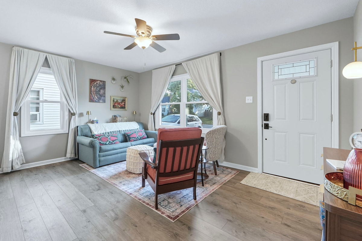 BERSIH COTTAGE-Y BANGLO DI TENGAH-TENGAH FORT WAYNE gabungan sempurna pesona bersejarah & hiasan pertengahan abad. Semua orang dialu-alukan di sini! -1 batu dari pusat bandar, PFW, & Indiana Tech. -Dekat dengan kedai kopi, restoran, perpustakaan, dan (mari kita jujur) Target -Smart TV & WIFI PANTAS - Cadar & cadar mewah -Bilik matahari yang selesa dan cerah untuk membaca & bekerja - Mesin basuh/pengering - Dapur lengkap - Tempat letak kereta tepi jalan -1 blok ke Lakeside Rose Garden yang bersejarah.