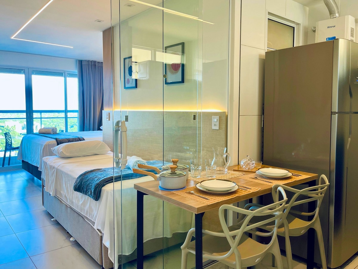 Studio dihias dengan standard yang tinggi dan direka untuk penginapan jangka pendek atau panjang. Sesuai untuk pasangan atau pengembara solo, sama ada untuk percutian atau kerja. Memuatkan sehingga 2 orang dengan semua keselesaan yang diperlukan. Terletak hanya 600 meter dari tepi laut, di jalan yang tenang dan damai. Semuanya berdekatan: pasar, farmasi, kafe dan restoran 10 minit dengan kereta. Nikmati nilai terbaik untuk wang anda untuk menginap berhampiran salah satu kawasan tepi pantai yang paling indah di Brazil, dengan akses mudah ke kawasan utama bandar.