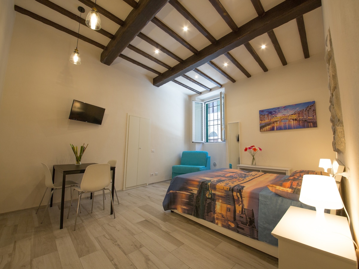 Quite and luminous studio to sleep 2, located on the left side of the river Arno, only at 30 yards/meters from Ponte Vecchio! The studio is on the third floor with lift and has a living room with parquet floor and a real double sized bed, bathroom with shower and fully equipped kitchenette! the double glaze window is overlooking the main street and the bathroom window has mosquito net , it is also provided of air conditioning/heating, Wi-Fi connection and tv wall mount for all your conforts