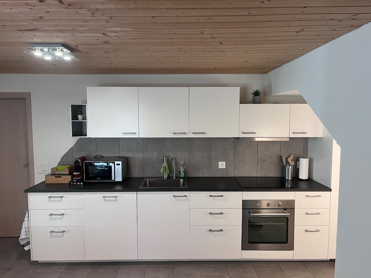 2-1/2-Zimmerwohnung mit 70m2 Wohnfläche. Die Wohnung befindet sich im Erdgeschoss und die ganze Wohnung ist mit einer Bodenheizung ausgestattet. Im Schlafzimmer hat es ein Boxspringbett 180/200cm und im Wohnzimmer ein Bettsofa 140/200cm für 2 Erwachsene. cosy 2.5 room apartment (70 m2) on the ground floor in a chalet style house. Not far from the town center. 1 bedroom with 1 Kingsize-Bed 180/200cm for 2 person, living room with 1 Queensize-Bed 140/200cm for 2 person.