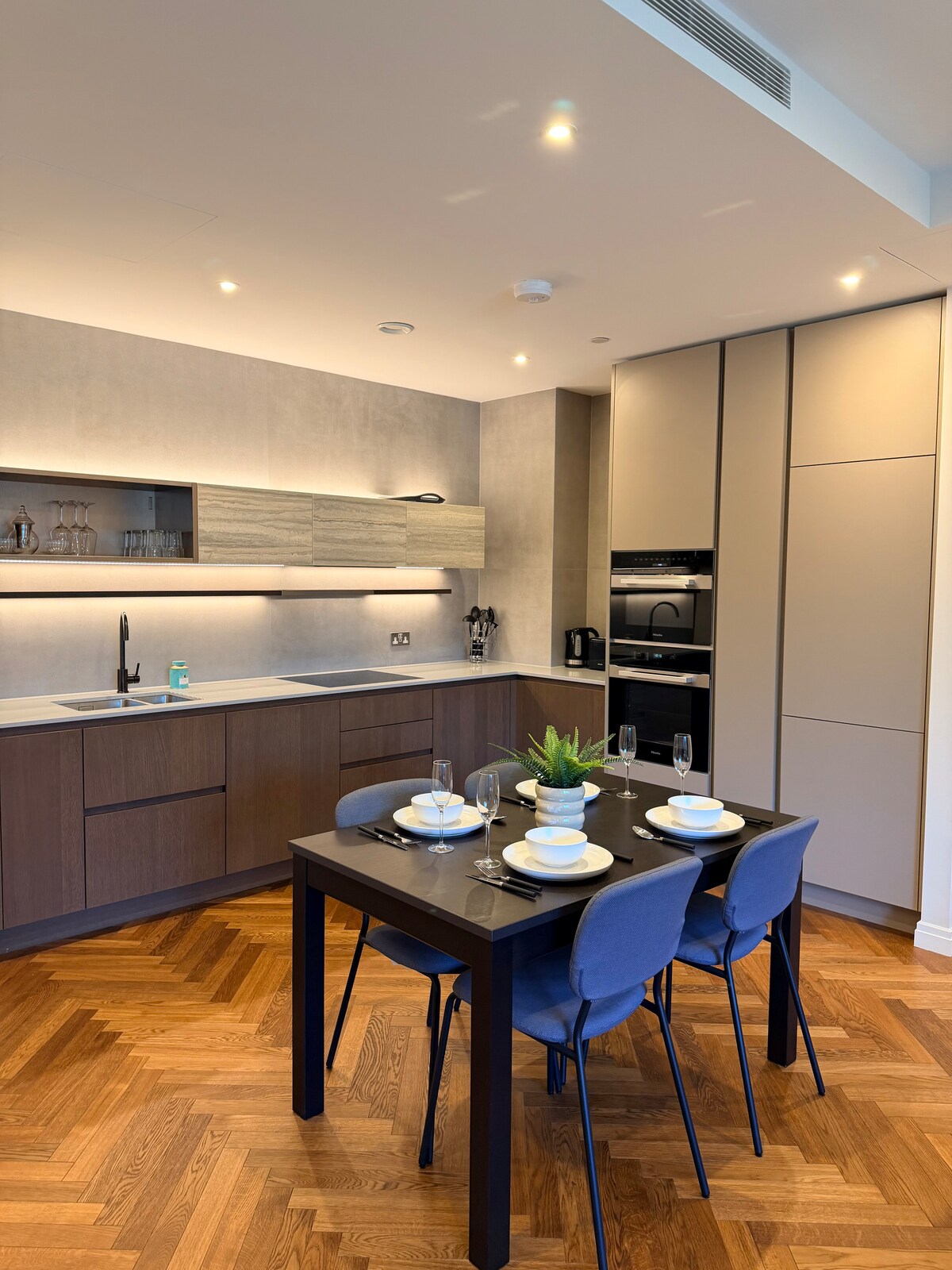 Nikmati segelas wain pada waktu petang dikelilingi kehijauan di teres taman persendirian apartmen yang mendapat inspirasi Itali ini. Di dalam, sofa sudut krim yang besar memudahkan anda untuk melambatkan langkah, berehat dan menenangkan diri. Terletak di SW10, apartmen ini menawarkan suasana kediaman yang lebih tenang sambil terus berhubung dengan seluruh London. Ini adalah tempat dengan gaya tersendiri — disusun dengan teliti, sedikit tidak dijangka, dan berbeza daripada penginapan biasa.