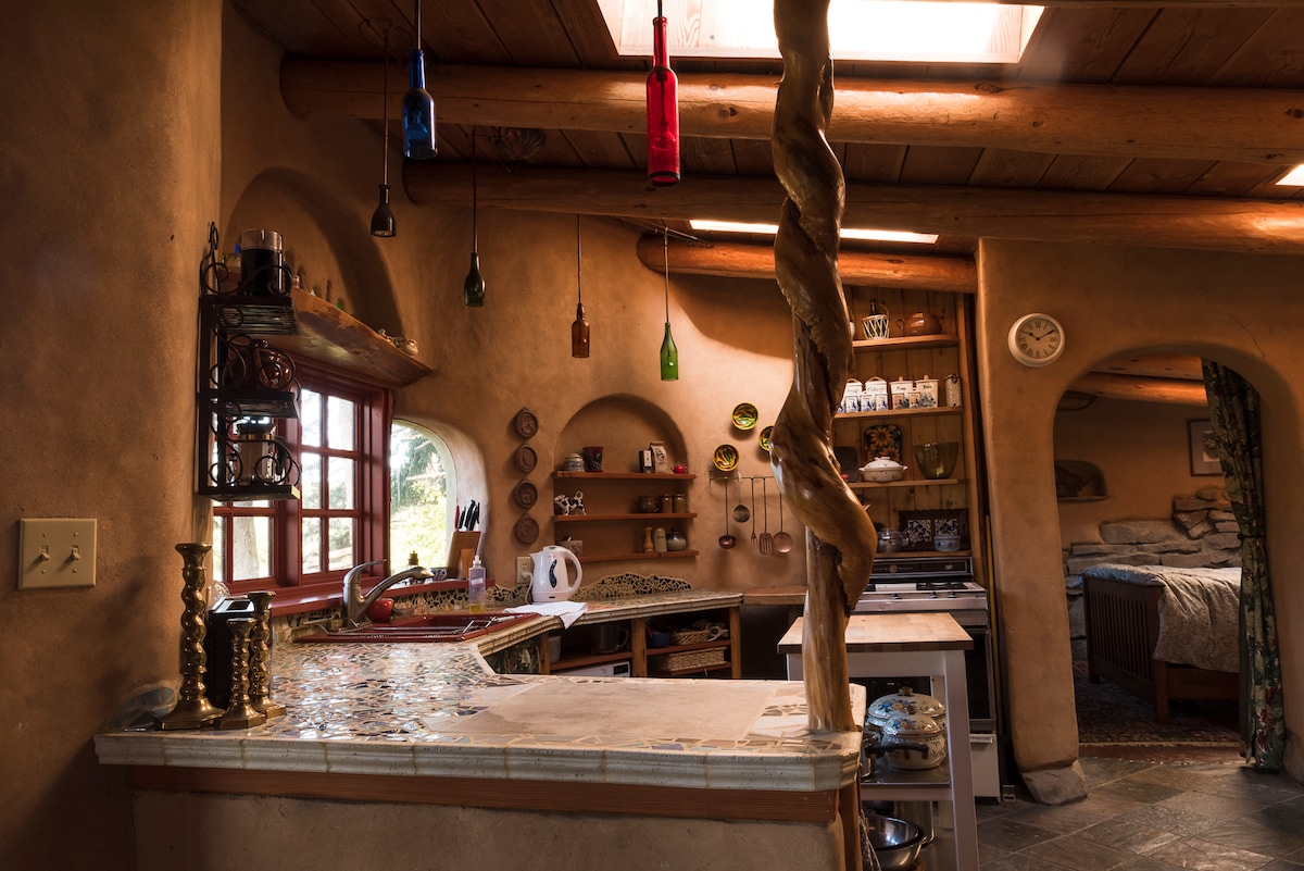 Salurkan susun untuk berhenti seketika di rumah bumi yang unik ini. Tempat percutian yang selesa ini diukir tangan menggunakan bahan semula jadi tempatan dan mampan, dan mempunyai ruang tamu pusat dengan tangga papak cantilever yang menuju ke bilik tidur loteng. Tetamu mempunyai akses kepada seluruh kotej dan penginapan di sekitarnya. Kami tinggal di rumah jiran, dan sedia memberi nasihat atau menjawab soalan untuk membantu anda memanfaatkan sepenuhnya penginapan anda. Kejiranan ini agak luar bandar dan kebanyakannya pertanian dengan beberapa ladang dan ladang anggur persendirian kecil. Rumah ini berjarak 10 minit berjalan kaki dari pantai dan 20 minit berjalan kaki dari kedai runcit dan deli keluarga yang mengkhusus dalam hasil organik tempatan. Pulau Mayne mempunyai bas komuniti kecil. Masa dan laluan adalah terhad, terutamanya pada musim sejuk. Ia akan berhenti di laluan masuk. Kami juga mempunyai sistem hiking hitch rasmi dengan Perhentian Kereta yang ditandatangani di mana anda boleh menunggu perjalanan. Biasanya anda tidak perlu menunggu lama. Kami gembira untuk menawarkan pengambilan dan penghantaran di dok feri sebagai ihsan untuk menggalakkan pengembara bebas kereta, pada hari-hari apabila bas komuniti tidak beroperasi. Sila beritahu kami lebih awal bahawa anda akan datang tanpa pengangkutan anda sendiri, dan kami akan memastikan sama ada kami atau bas komuniti (yang akan menurunkan anda di laluan masuk kami) berada di sana untuk bertemu anda apabila feri anda tiba. Terminal Feri BC berhampiran Victoria dan Vancouver boleh dikunjungi dengan mudah melalui transit awam dari lapangan terbang dan pusat bandar masing-masing.