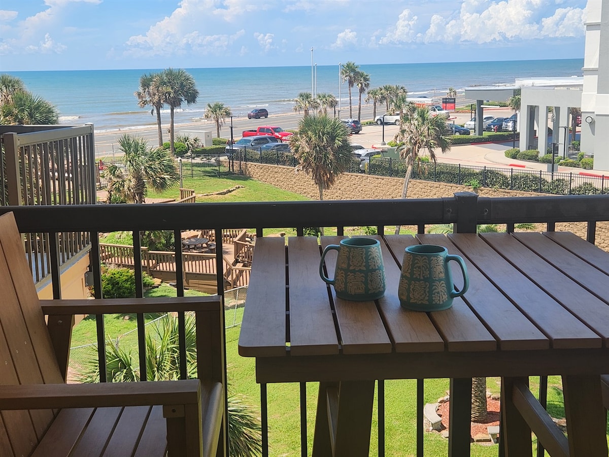 Pemandangan laut yang tidak terhalang! Lihat sepanjang jalan ke pantai Galveston. Empat bilik tidur dan 3 1/2 bilik mandi. Banyak ruang dan beberapa dek untuk menikmati matahari. Anda mempunyai ruang untuk melayan tetamu, di dalam rumah pantai, tetapi juga di bawahnya di mana anda akan menemui bar terbina dalam yang besar, barbeku propana/arang, buaian, loteng buaian rajut dan pancuran mandi luar. Berpagar di halaman. Berjalan kaki persendirian ke pantai. Dapur gourmet dengan pantri butler. Tv ada di dalam setiap bilik. Bilik utama mempunyai tab mandi rendaman dengan pemandangan pantai! Muat 14 orang tidur