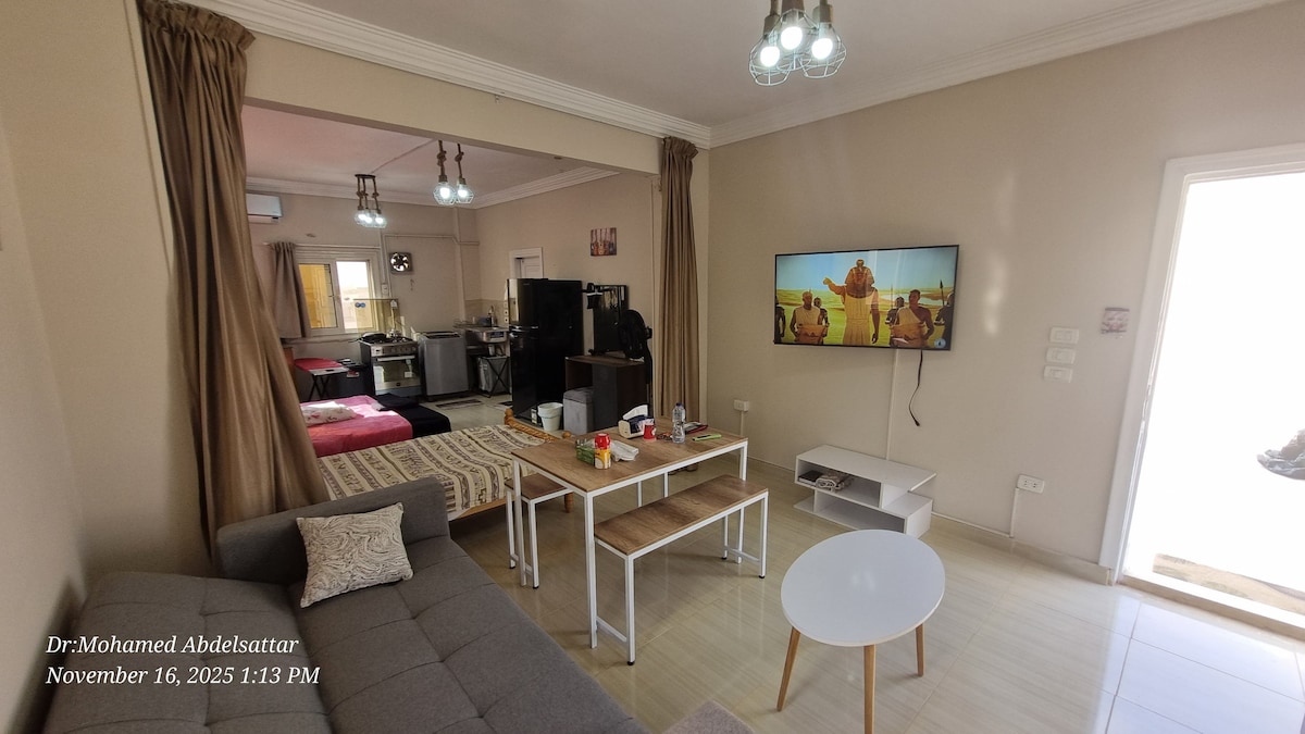 دور ثالث سطح بدون اسانسير استديوbe fit and Relax with 3rd floor no elevator roof. Newcairo 20 min airport, Bring the whole family or your friends or solo to this great place sunny roof , place centered at the heart of NEW CAIRO surrounded by international schools , Hospitals and near malls . very safe area surrounded by cameras . The Space: • Bright and airy living area • Fully equipped kitchen for whipping up gourmet meals . • bathroom with [ rain shower]. • High-speed WiFi • Smart TV