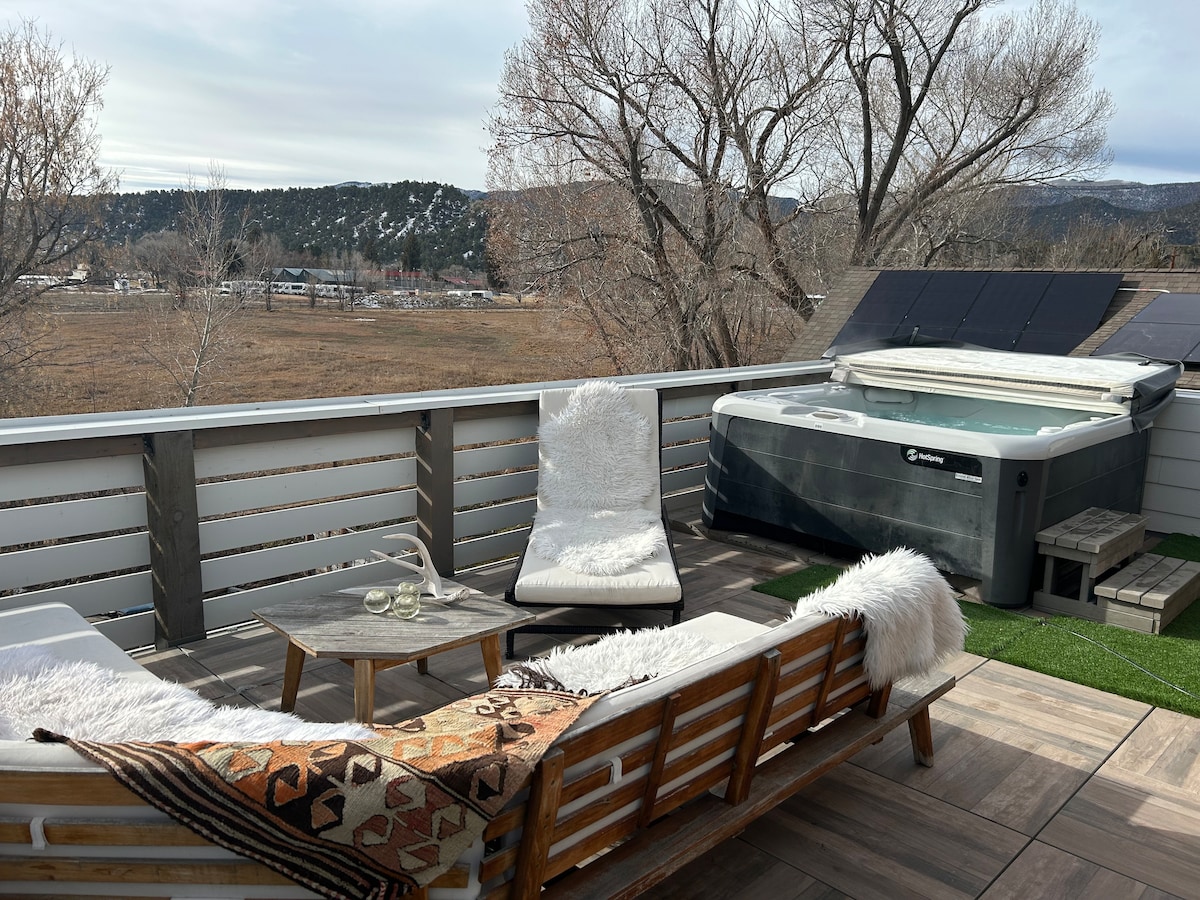 Rumah ladang moden. 2 Bilik Tidur paling luas di Carbondale. Rumah persendirian / berdiri sendiri Telah diubahsuai sepenuhnya pada Musim Luruh 2018. Terletak di penginapan Luar Bandar betul-betul di sebelah Downtown Carbondale. Tetapan Tenang, Pokok Dewasa, Padang Rumput dan Kolam. Pemandangan Gunung, Dua Patio Dilindungi, Satu dengan Meja Makan Patio dan kerusi untuk 6 orang. Pemanggang Barbeku Gas dan Matahari Terbenam Menakjubkan. 35 minit memandu ke Aspen / Snowmass. Dikelilingi keindahan Roaring Fork Valley.