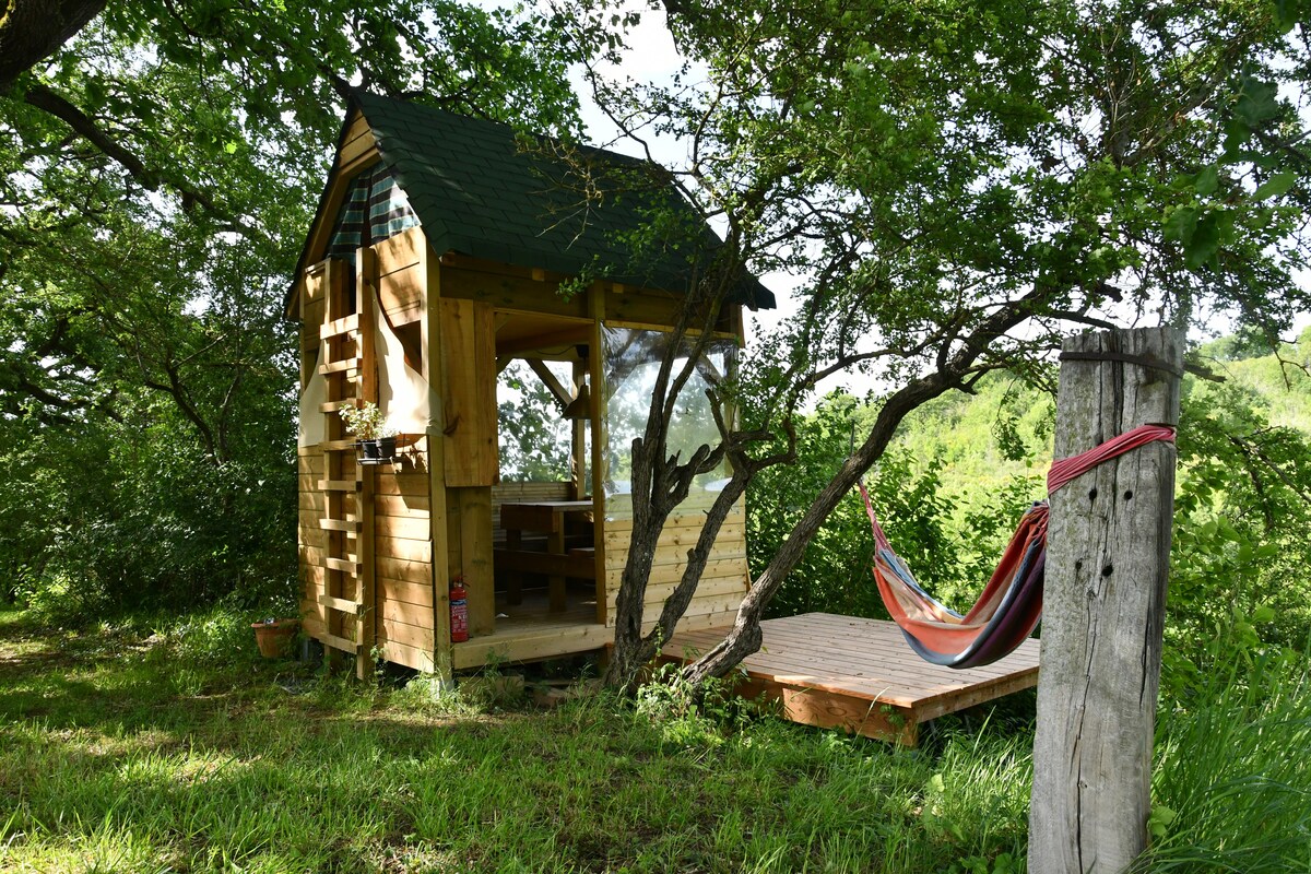 Penginapan jenis kabin kecil, katil tinggi 140x190 dengan akses tangga. Dapur dan ruang makan yang terlindung di bawah dengan elektrik: cerek, plancha, mesin pembuat kopi, pinggan mangkuk, peralatan makan. Ruang tamu luar dengan teres. Di kabin Bivouac, perlu menyediakan beg tidur atau duvet dengan cadar, dan tuala mandi. Bilik mandi dikongsi di luar dengan tandas kering dan pancuran mandi, menghadap alam semula jadi dan terletak dalam jarak 30m.