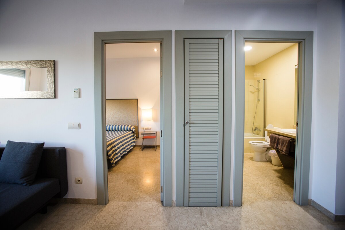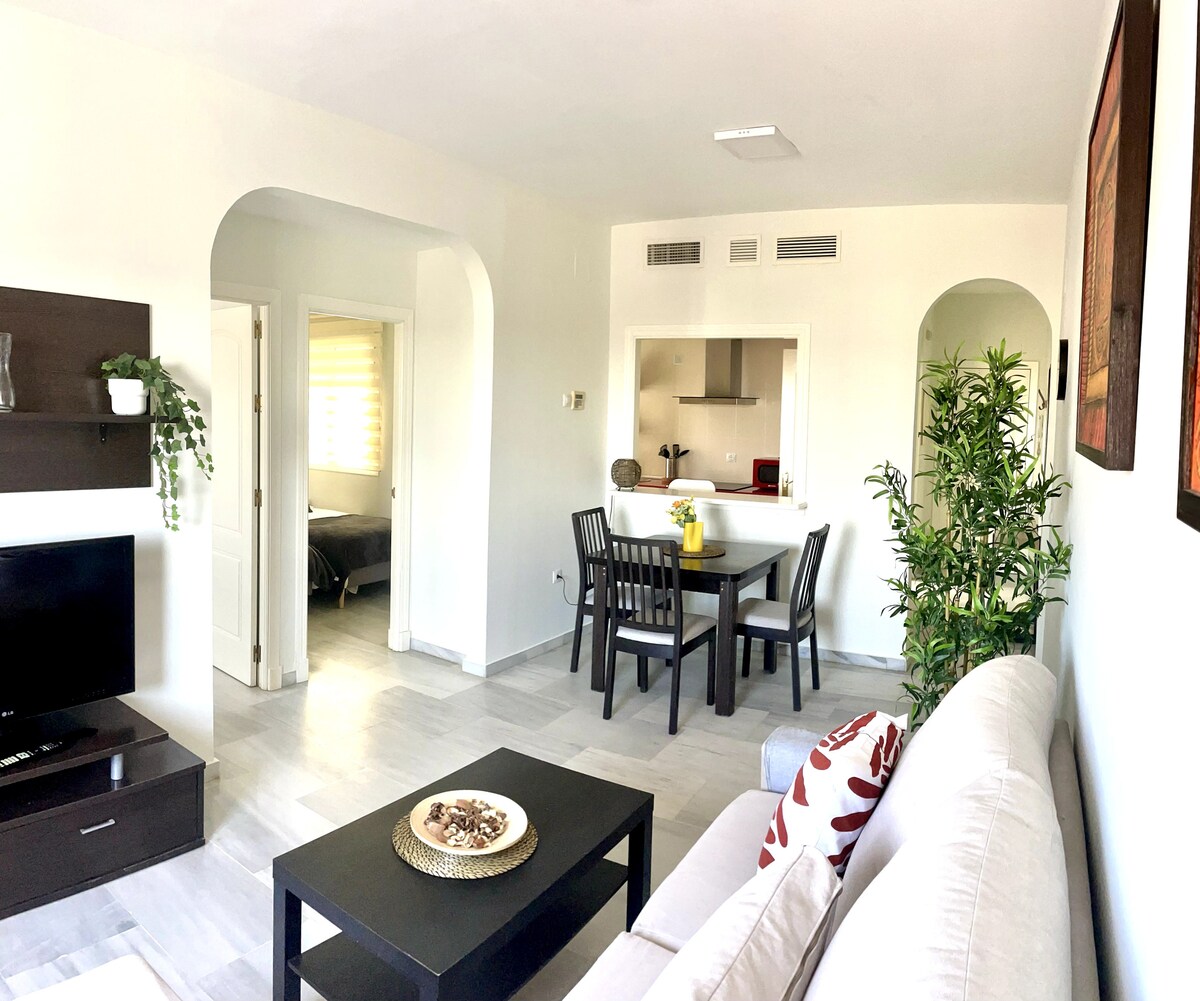 Coqueto apartmen untuk 4 tetamu, dengan 1 ruang garaj, 12'dengan kereta dari Historic Hull of Seville atau, jika anda lebih suka menaiki bas, 20' (hentian adalah 8'berjalan kaki). Ruang tamu yang selesa dengan dapur kecil yang lengkap, bilik tidur yang luas dengan 2 katil dan katil sofa dua katil di ruang tamu dan bilik mandi yang besar. Ada kolam renang. Bangunan dengan penerimaan tetamu 24 jam dan WiFi. Pasar raya, panggung wayang dan restoran dalam jarak 1 minit berjalan kaki.