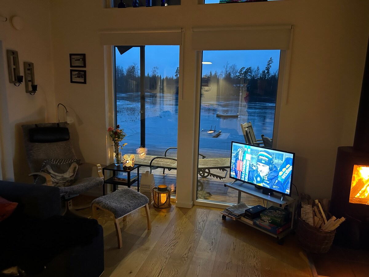 Pondok baru diubahsuai seluas 80 meter persegi yang baru-baru ini mengalami pengubahsuaian menyeluruh. Ia boleh menempatkan sehingga 7 orang, dengan katil di 3 bilik tidur + sofa katil dengan dua tempat tidur. Kediaman ini terletak di tepi tasik dengan jambatan peribadi dan sauna kayu api (kayu api disertakan) serta kawasan barbeku untuk menikmati makanan di luar. Pondok ini mempunyai patio di bahagian hadapan, balkoni yang besar dan balkoni di mana anda boleh bersantai, makan dan berjemur. Terletak kira-kira 15 minit dari Isaberg Mountain Resort.
