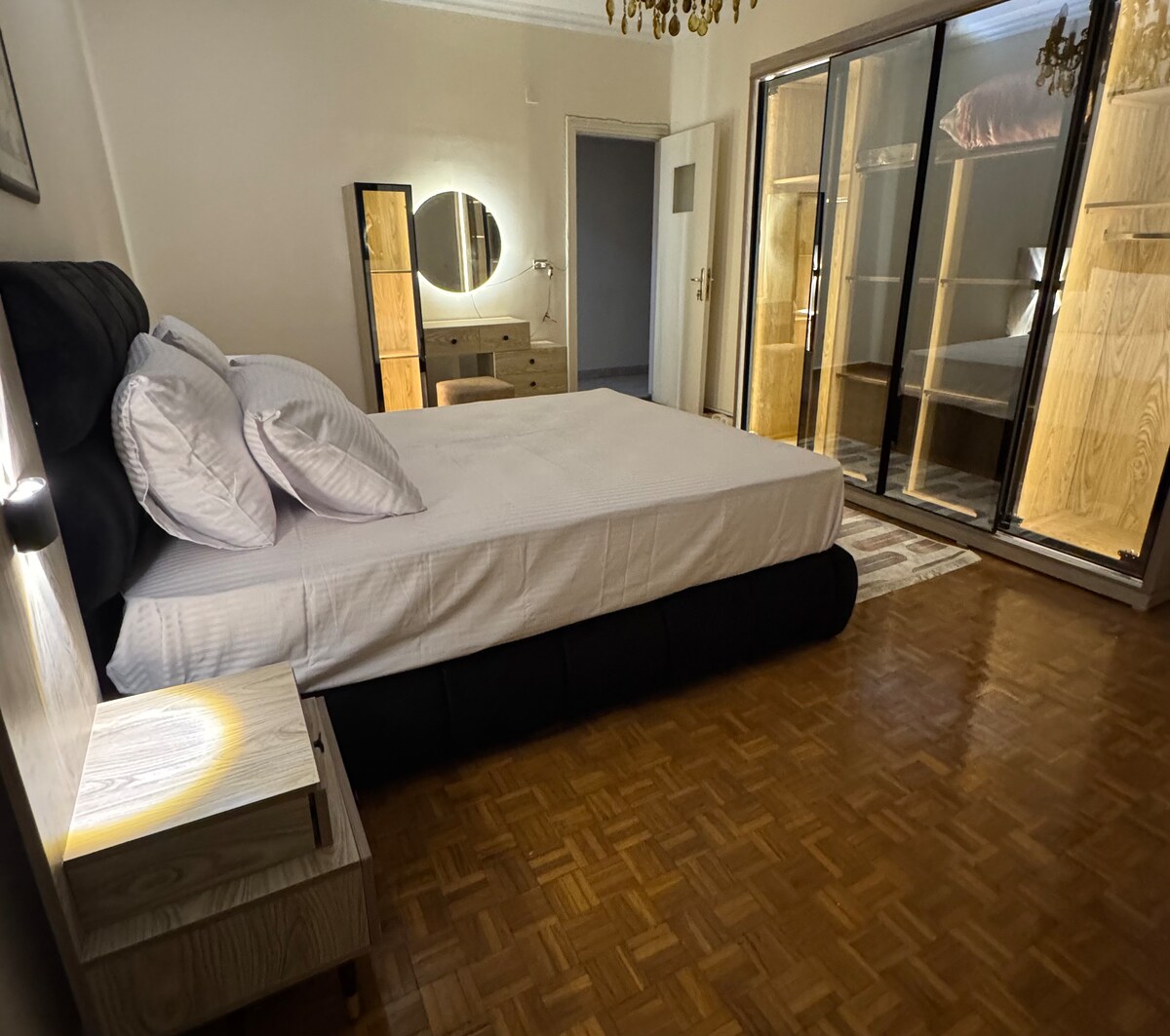 Enjoy a chic experience at our centrally-located Apartment, in the heart of Degla Maadi. Very close to Shopping Area, restaurants and Bars. Perfect for business trips, solo travelers & couples. This unique and chic space is located at Road 206 In Degla Maadi, one of Cairo's hot spots, at the heart of Cairo. Fully furnished and equipped space with 2 double bed and king size bed and Bathroom