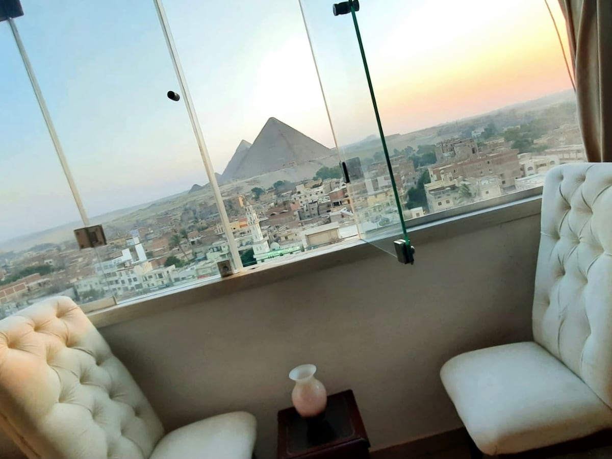 Selamat datang apartmen kami! Hanya 5 minit berjalan kaki dari pintu masuk Sphinx dan Piramid, dengan pemandangan balkoni yang menakjubkan. Terletak di kawasan tempatan yang selamat dan meriah berhampiran restoran, kafe, kedai buah-buahan, pasar, dan farmasi. Apartmen ini berhawa dingin sepenuhnya, dengan Wi-Fi pantas tanpa had, dapur yang serba lengkap, cadar bersih, tuala bersih, dan suasana yang tenang. Mungkin tempat terbaik untuk menikmati pemandangan Piramid!