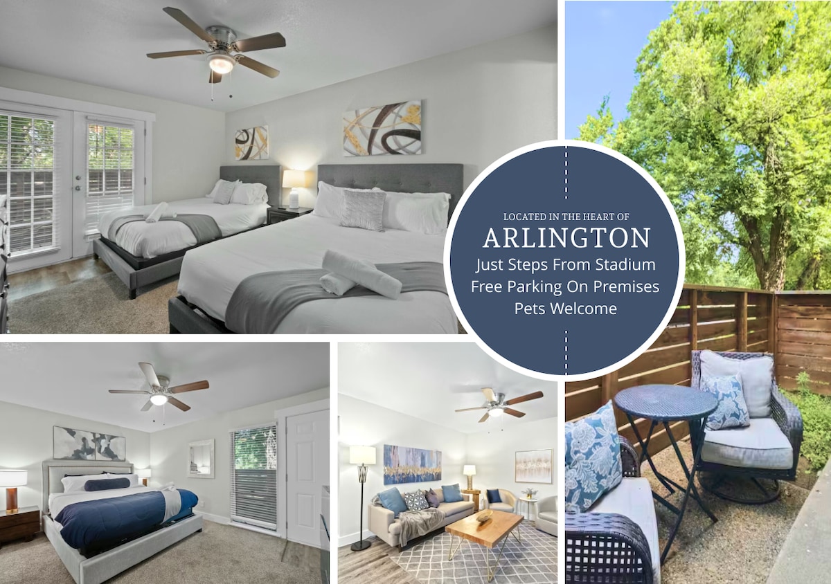 Menginap dengan bergaya dan selesa di apartmen Arlington yang baru diubah suai ini! Berjalan kaki ke Stadium AT&T dan hanya 1 batu ke Globe Life Field & Park, berhampiran UNT & Six Flags. 1 bilik tidur yang luas dengan katil mewah, sofa kulit, dapur penuh dengan kaunter granit, bilik mandi yang dikemas kini dan 3 almari besar. Dibersihkan secara profesional dan dihoskan dengan teliti, ia adalah pangkalan yang sesuai untuk acara atau bersiar-siar. Perlukan ruang tambahan? Tanya saja!