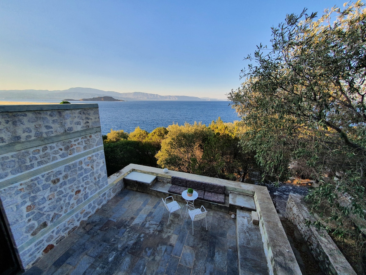 Percutian Tebing - Pantai Persendirian - Pemandangan Menakjubkan The Cliff Retreat menawarkan anda percutian terbaik dan suasana santai dengan pemandangan 180 darjah Teluk Argolic yang menakjubkan. Pengalaman yang unik sepenuhnya, berjalan-jalan melalui tangga berukir batu melalui pintu masuk persendirian ke pantai kerikil air biru jernih. Setiap bilik direka untuk memaksimumkan pemandangan laut dan bersantai dengan bunyi berirama ombak hanya beberapa meter di bawah. Tempat yang ideal untuk keluarga dengan kanak-kanak atau hujung minggu romantik.
