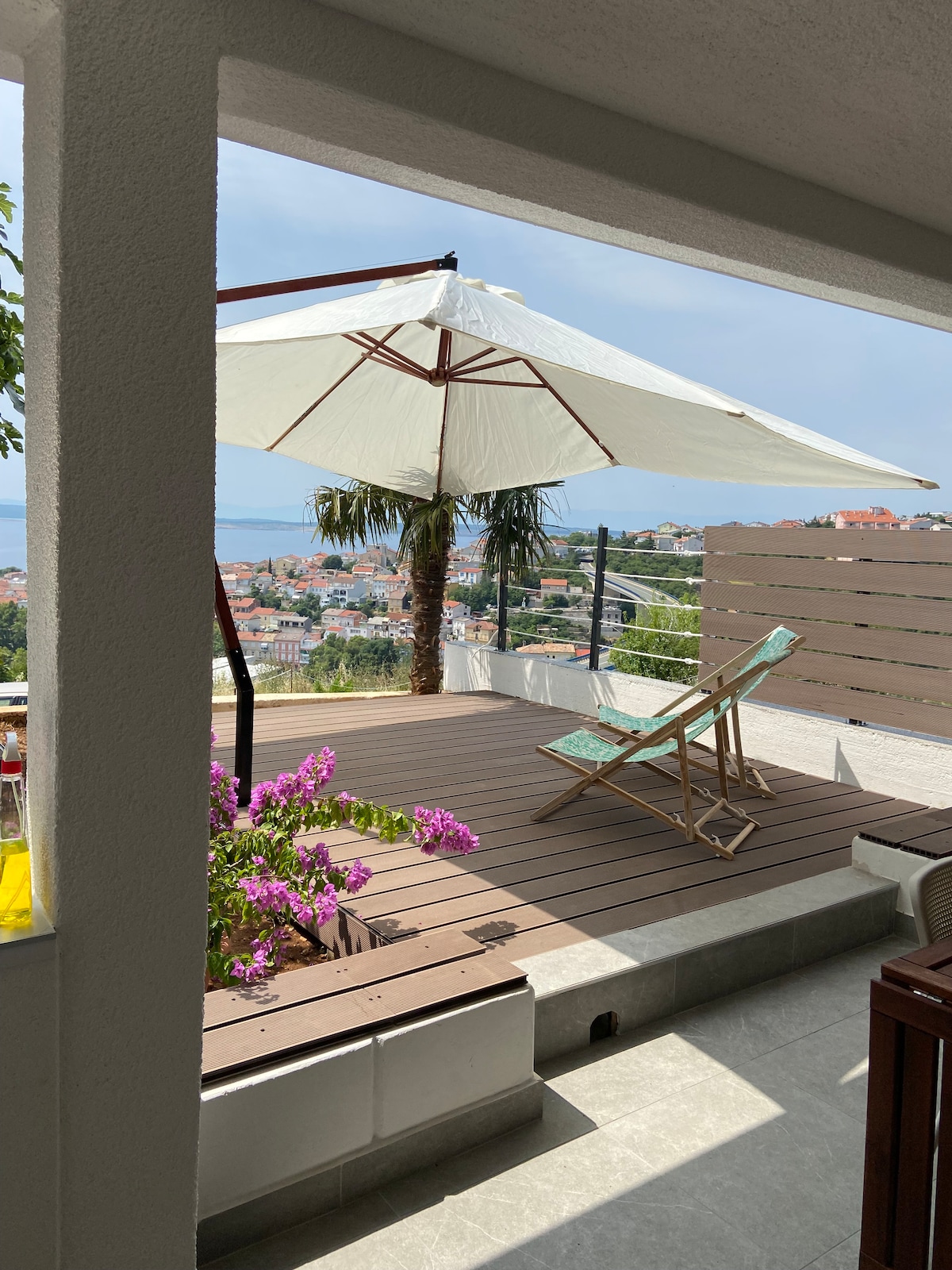 Kapasiti 2+2, saiz 42 m2, dengan halaman berpagar yang besar dan kolam renang. Terletak di tingkat bawah di sebuah rumah keluarga di jalan yang sunyi; baru dibina dan dilengkapi sepenuhnya dan berperabot. Rumah ini dikelilingi dengan pepohonan dan menawarkan pemandangan laut yang tidak terhalang. Binatang peliharaan tidak dibenarkan, dan tidak merokok di dalam apartmen. Ia boleh diakses untuk orang kurang upaya. Kolam air panas (Mei-Oktober) : 8x4m, kedalaman 1,5m. TV satelit, wifi, A/C, peti keselamatan, tempat letak kereta, pendiangan/gril, teres, kerusi dek dan payung di tepi kolam renang.