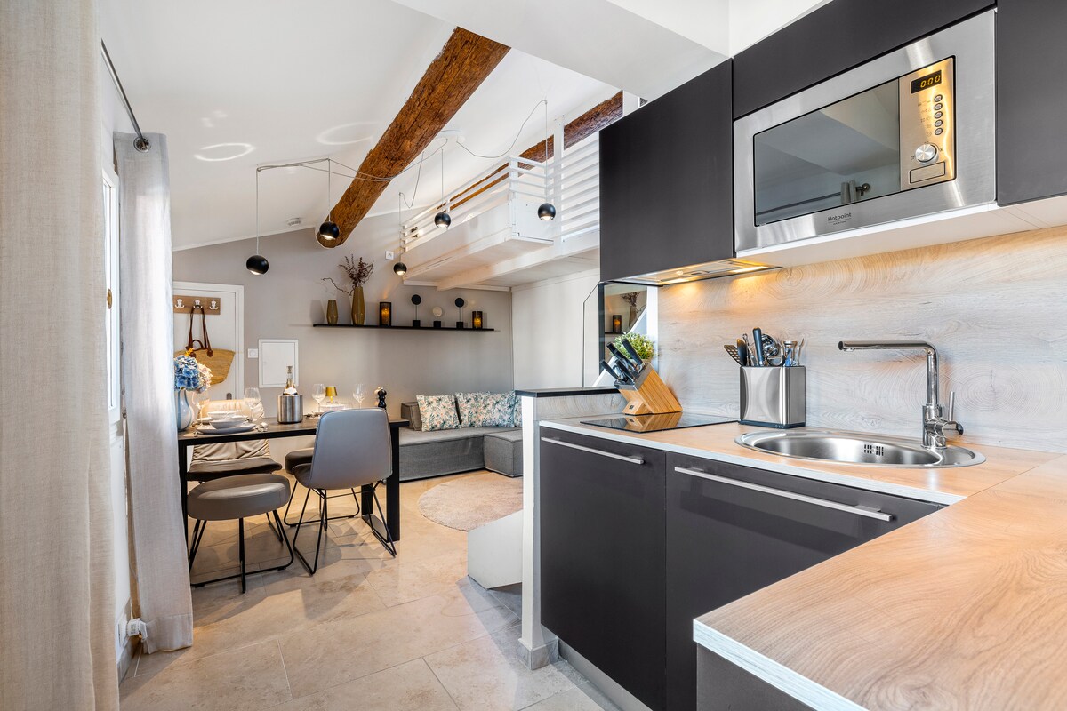 Apartmen mewah berbumbung teres dalam persekitaran istimewa. Apartmen ini terletak di tengah-tengah bandar lama Antibes yang indah, terletak secara senyap-senyap namun sangat berpusat. Dari teres bumbung yang baru direka, anda akan mendapat pemandangan indah bumbung Antibes. Seluruh apartmen ini baru dilengkapi perabot pada tahun 2021 dan kini sangat selesa.