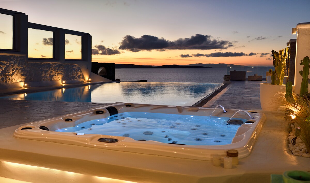 ✨Myconian Seaside Luxury Villa , dengan akses ke pantai berpasir yang terpencil✨ Matahari terbenam minimalis 3 tingkat menghadap vila dengan hiasan dalaman moden, dilindungi angin, luas(280sq.m), dengan pemandangan yang menakjubkan sehingga ke Paros dan Naxos. 🏡 Ciri-ciri: 🛏️ 6 Bilik Tidur Ensuite semuanya dengan A/C, TV pintar, Wi-Fi, dan bar mini. 🚿 7 bilik mandi 🧑🤝🧑Memuatkan 16 tetamu Kemudahan Luar: Kolam renang persendirian 🏊♂️ 90 meter persegi 🍖 BBQ dan Tempat Makan Luar Ruang rehat dan tempat duduk 🛋️berbilang