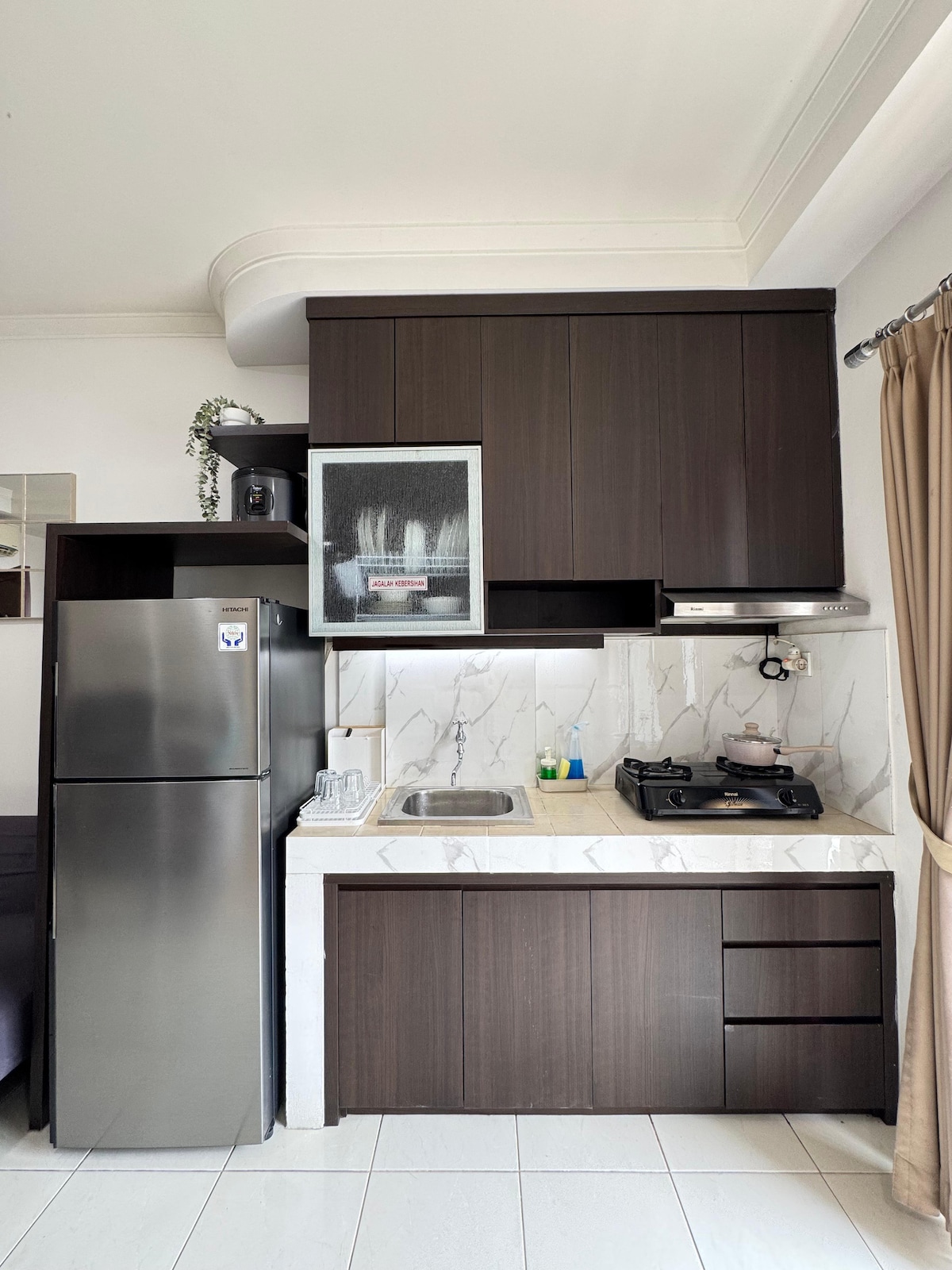 Studio 24 meter persegi yang elegan di pusat Jakarta, menggabungkan gaya dan kemudahan. Termasuk dapur, Wi-Fi laju, penulen udara, TV pintar 43", sistem bunyi dan Netflix. Ia sesuai untuk pelbagai jenis penginapan, dengan akses tanpa sentuhan dan kemudahan seperti kolam renang, jakuzi, gimnasium dan bola keranjang, Kini menampilkan dispenser Osmosis Terbalik & pelupusan sisa makanan, Gambar menunjukkan dapur gas yang telah digantikan dengan periuk induksi (untuk mematuhi garis panduan apartmen untuk bahaya kebakaran)