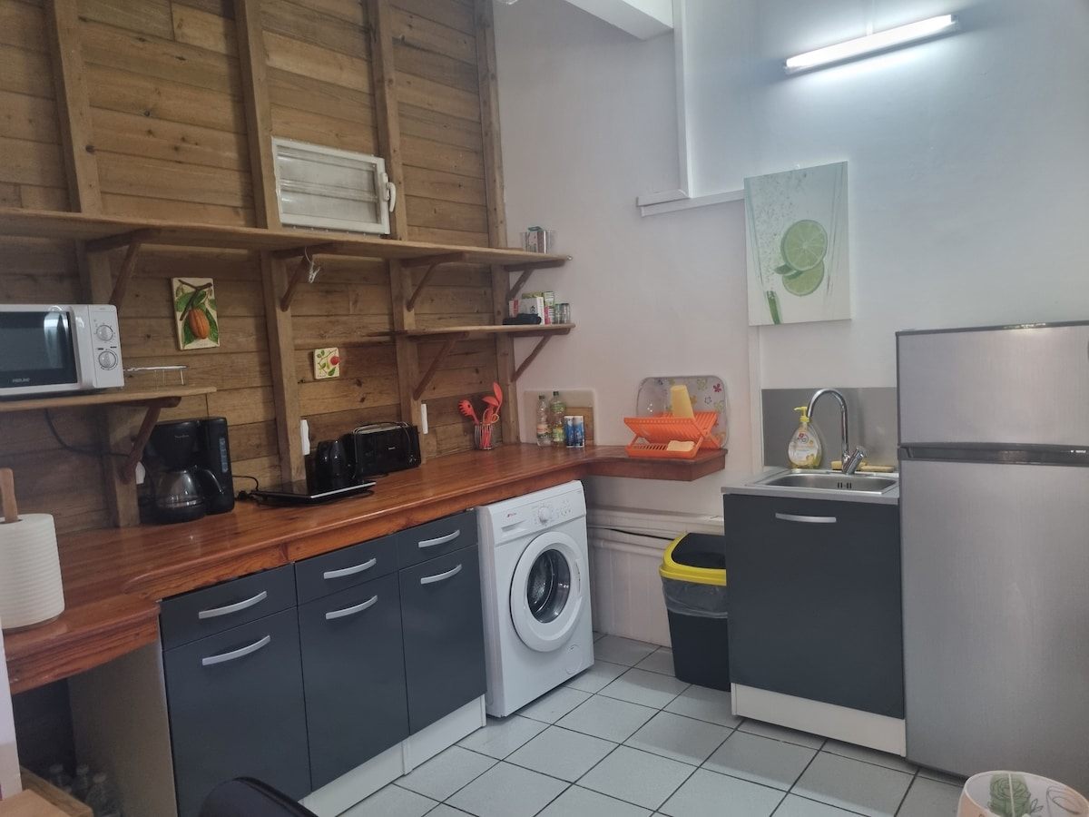 Charming F2 at the bottom of the villa on Petit-Bourg (center of the island) composed of 5 beds max: - 1 bilik berhawa dingin dengan katil queen + 1 katil single - 1 ruang tamu dengan katil sofa (tilam sebenar), TV, perpustakaan, 1 kipas - 1 dapur yang dilengkapi dengan peti sejuk, ketuhar, ketuhar gelombang mikro, cerek, pembuat kopi - 1 bilik mandi dengan pancuran mandi - 1 teres - Kolam renang (dikongsi dengan studio bersambung (sewaan mungkin: lihat "f2+studio") hubungi kami: P31738441 nb: villa top occupied by the owners
