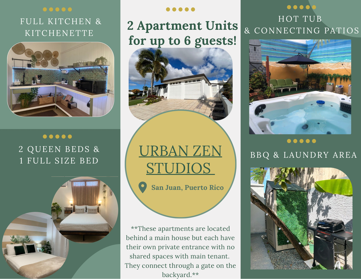 By booking this listing you get: **2 SEPARATE APARTMENT UNITS (6 guests) divided by an outdoor hallway with amenities such as Jacuzzi, Whirlpool, BBQ, Patio, Laundry, full Kitchen & kitchenette, 2 parking spaces, A/C, Generator and more! Centrical location close to the Airport, Old San Juan, Condado nightlife, restaurants and attractions. You may use Uber services or rent a car. (These are apartments located behind a main house but you will have your own private entrance with no shared spaces.