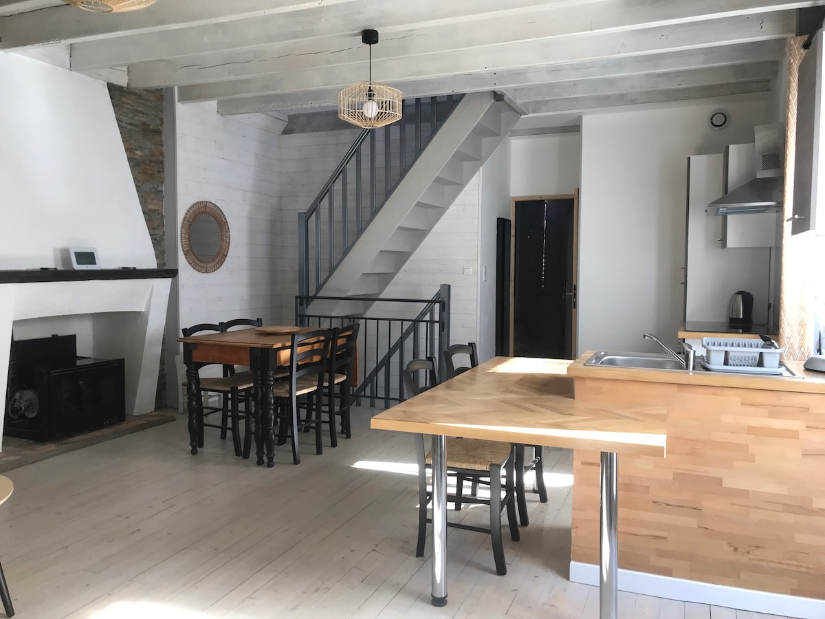 Rumah kecil yang diubahsuai sepenuhnya seluas 60m², terletak di dusun yang sangat tenang. Anda akan menemui di tingkat bawah: - ruang tamu dengan sofa bed dan TV, - tandas bebas, - dapur lengkap. Tingkat atas: - bilik tidur cantik dengan 1 katil 140x190cm, 1 katil 90x190cm dan 1 katil dengan TV. - kamar mandi Akomodasi dilengkapi dengan pemanas aerothermia dan AC. Anda akan mempunyai beranda kecil dan halaman di luar dengan barbeku tersedia.