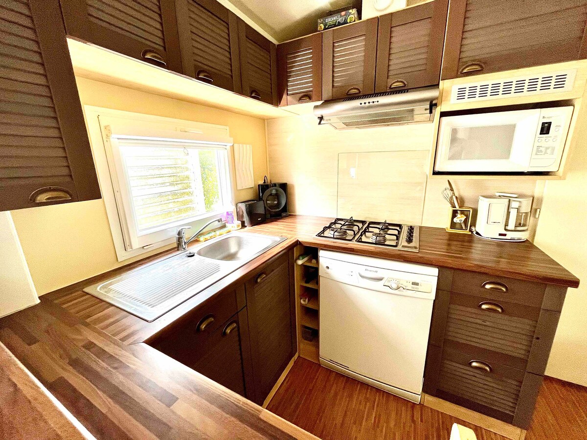 Mobilhome di tapak perkhemahan 4 bintang di semenanjung Cap-Ferret. Bilik tidur utama dengan 1 katil kelamin dan bilik persalinan bersambung, 2 bilik tidur dengan 2 katil berasingan. Dapur lengkap dengan kompor gas, ketuhar gas, ketuhar gelombang mikro, pembuat kopi termasuk dolce gusto, mesin basuh pinggan mangkuk, peti sejuk dengan peti sejuk... 1 TV besar di ruang tamu dan 1 mesin basuh tersedia. Penyaman udara. Teres besar tertutup, padang dengan meja, plancha, 2 kawasan berjemur...anjing tidak dibenarkan (alahan)