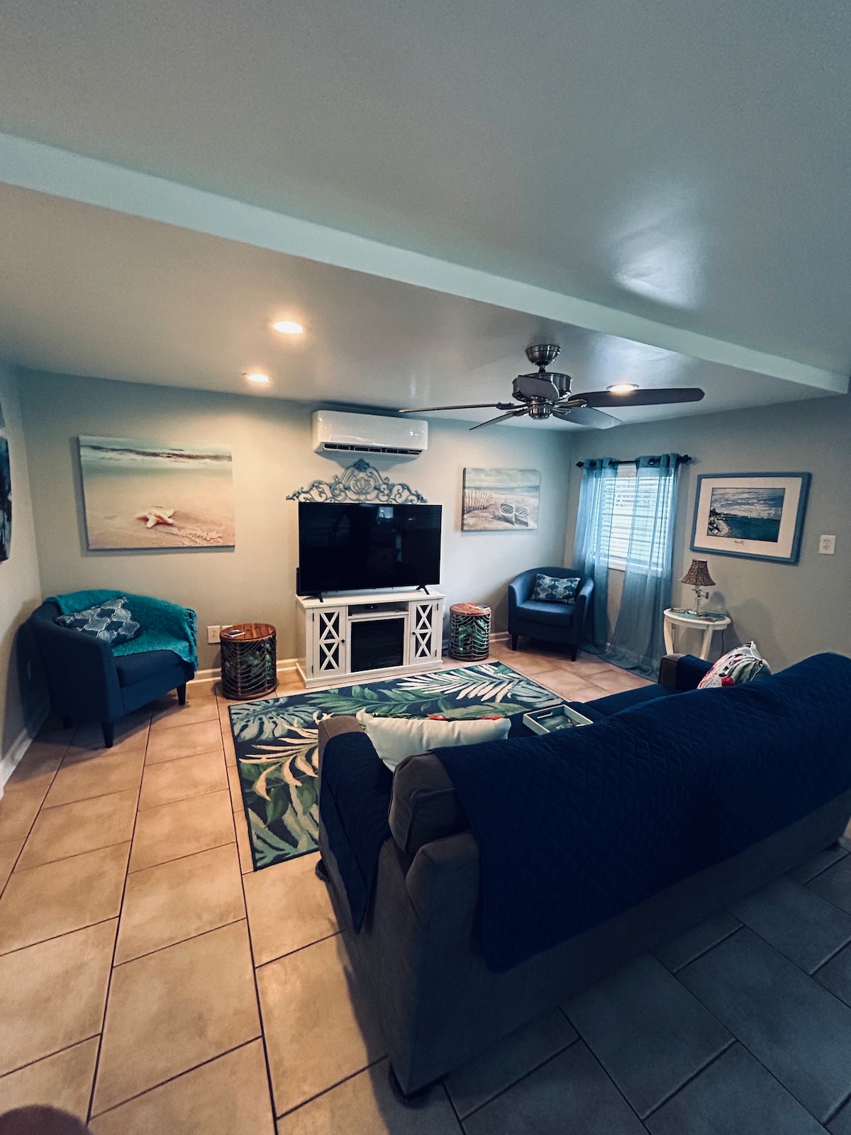 Walk to restaurant/bar, Mango Marley's, across street. Coffee, ice-cream & shopping 2 minute walk End unit on beach side of Hwy 98 - easy/safe short walk to beach Extra parking for vehicles/boat 2 King Suite bedrooms, one with 2 twin beds, both with mounted TV 3 Back Decks have beach views and sunsets Quality Sleeper Sofa Washer & Dryer 70" living room TV Wifi Outdoor shower Grill Gas Firepit Beach/Fishing Cart to make short walk to the beach easy Beach Chairs Bikes No Pets & No Smoking