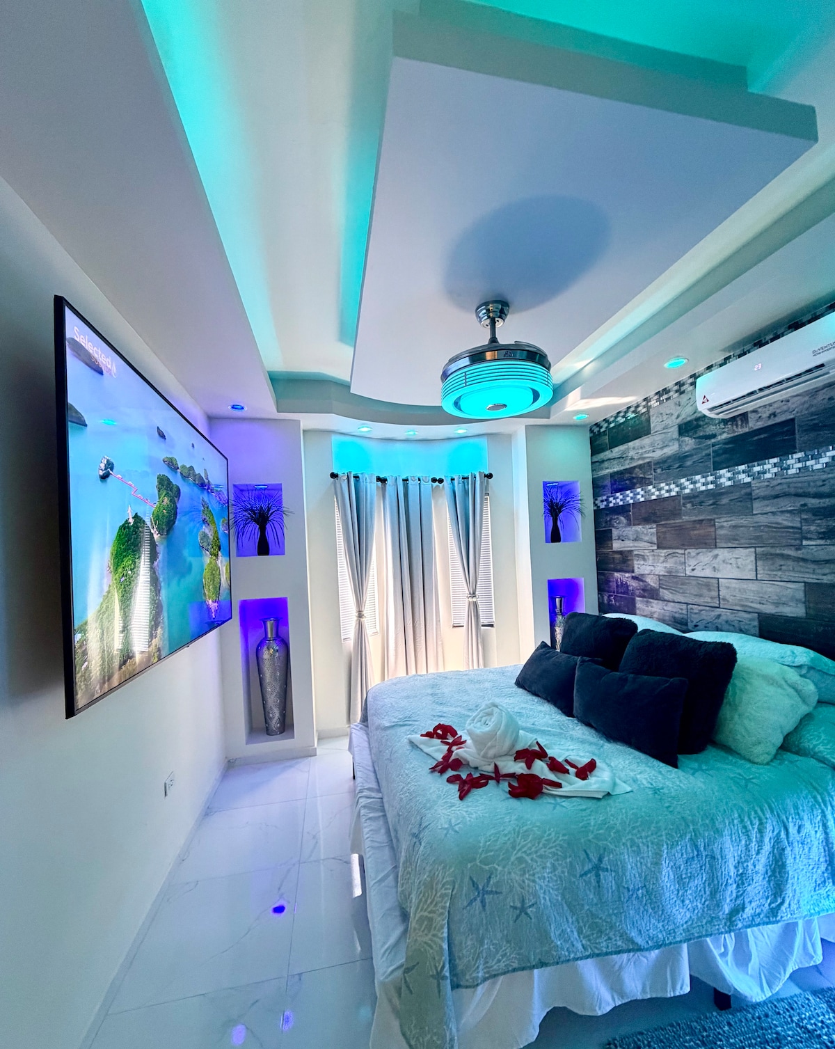 Katil saiz king, TV Pintar 86 inci dengan Netflix, Wi-Fi, kipas siling dengan Bluetooth. Di bilik mandi, cermin diaktifkan dengan sentuhan, dan kipas ekzos bilik mandi mempunyai Bluetooth. Penyaman udara mini-split di bilik tidur dan bilik mandi. Terdapat bar mini. Terdapat kerusi urut berpanas. Ia mempunyai teres di tingkat 2 dan satu lagi di tingkat 3 dengan pemandangan laut dan gunung. Ia mempunyai tempat letak kereta persendirian di dalam penginapan; anda akan diberikan alat kawalan jauh untuk membuka pintu pagar. Anda diingatkan bahawa haiwan peliharaan tidak dibenarkan.