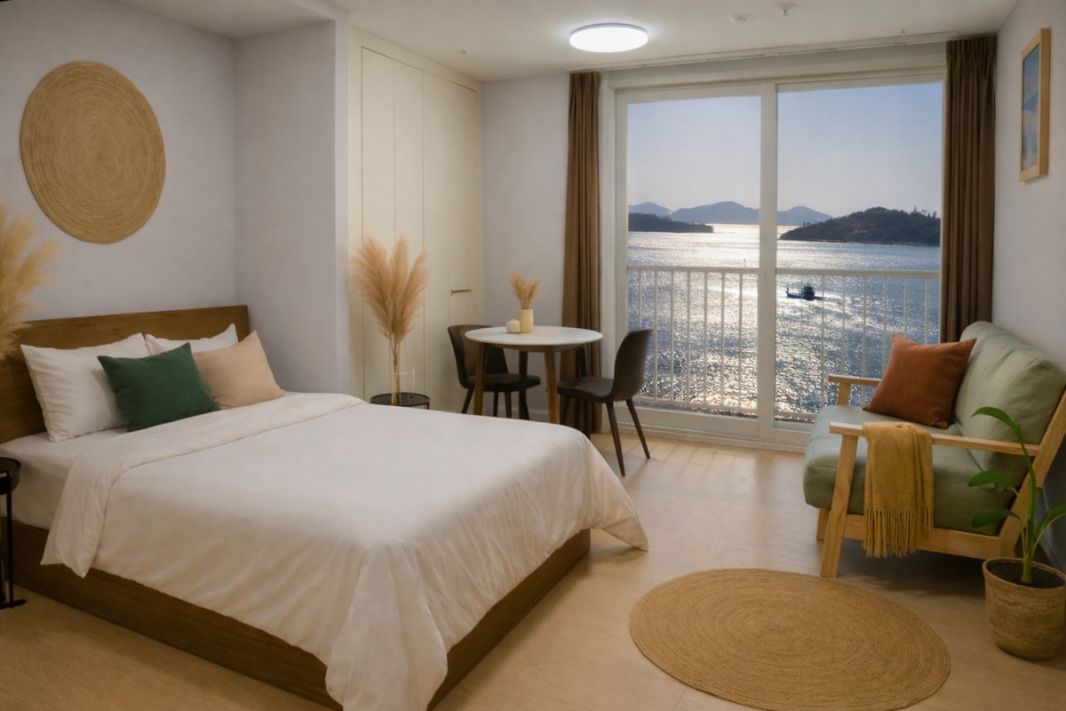 (Harga istimewa)#Teres Pemandangan Laut/Pelabuhan Marina/10 minit dari Stesen Yeocheon/1 minit berjalan kaki ke pasar raya/Bilik untuk 3 orang (2 katil)/Moden dan kemas/Parkir percuma
