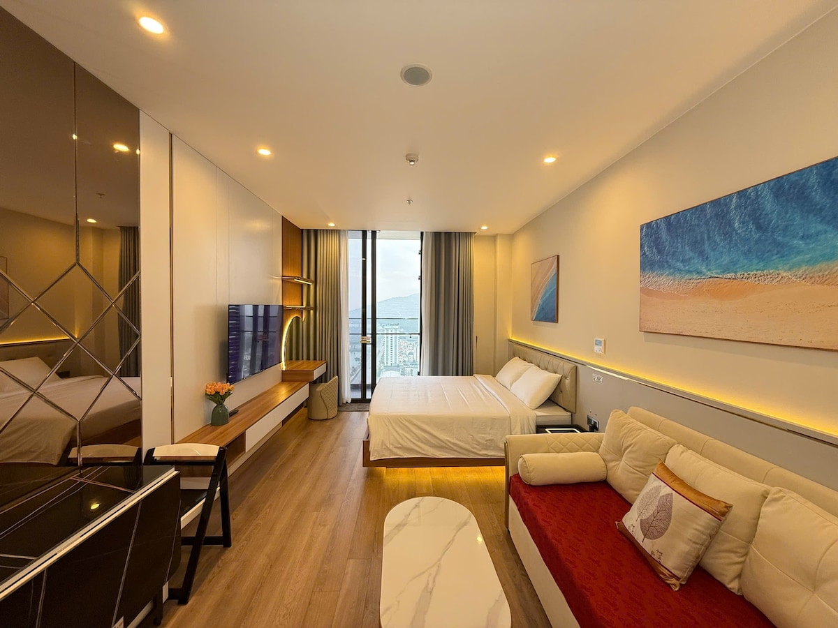 - Sorotan utama ialah bilik pemandangan laut di mana anda boleh menghirup kopi pagi anda, menonton matahari terbit yang cerah atau bersantai dengan matahari terbenam yang romantik di atas laut. - Apartmen ini terdiri daripada 1 bilik tidur, ruang tamu yang bersambung dengan dapur dan sesuai untuk pasangan atau keluarga kecil. Perabot yang selesa: penyaman udara, wifi berkelajuan tinggi, TV pintar, dapur,... membawa suasana keselesaan seperti di rumah tetapi masih melengkapkan pengalaman resort. - Lokasi betul-betul bersebelahan dengan pantai – hanya beberapa minit berjalan kaki, anda sudah boleh berjemur di bawah air biru yang jernih.