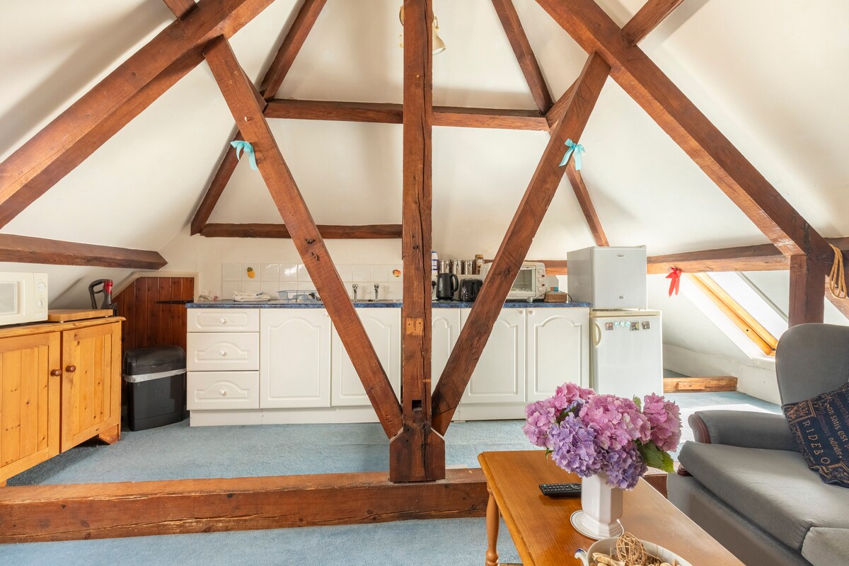 Bangunan berbingkai oak yang cantik dengan pemandangan turunan selatan yang indah. Penginapan yang terdiri daripada lounge selesa dengan TV, wifi dan pembakar log. Dapur dilengkapi dengan mesin basuh pinggan, ketuhar dan ketuhar gelombang mikro. Satu bilik tidur double di tingkat bawah dengan bilik pancuran mandi en suite. Di tingkat atas terdapat mezzanine dengan dua katil bujang dan ruang duduk di atas kawasan rehat dengan bilik mandi dengan bilik mandi berdiri percuma. Ruang luar adalah patio menghadap selatan dengan meja dan kerusi dan BBQ tersedia.