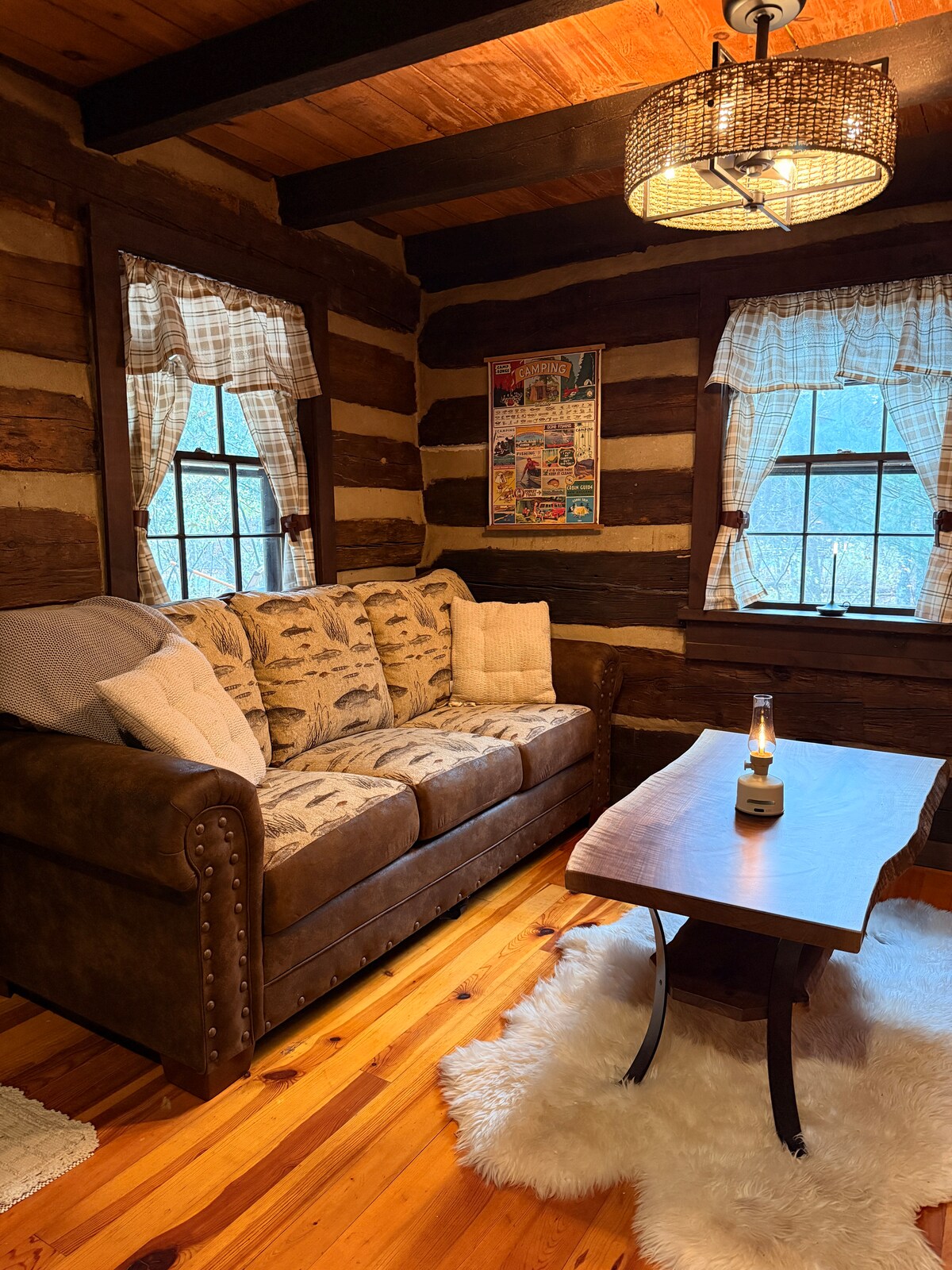 Rustic, 100+ year old primitive mountain cabin in West Virginia along the Cacapon River. Beautifully restored with wood stove, loft, & screened in porch. Access to 214 acres of private mountain land & over 1/4 mile of river frontage plus 1/2 acre pond, trails, and private shooting range. This cabin is 1-room and completely off grid. It has NO electricity or plumbing/running water, but does have a Porta-John serviced weekly. Renter will be cabin camping so pack accordingly; tents also welcome.