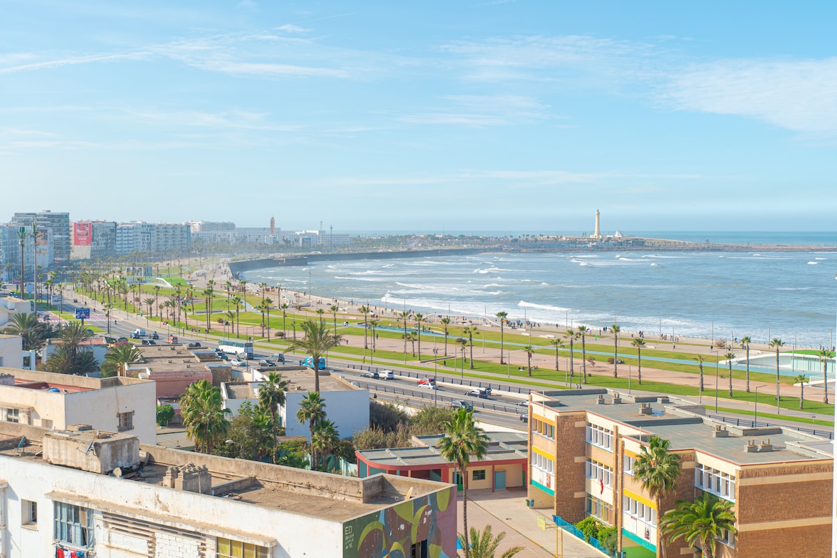⚠️Parti dan muzik yang kuat dilarang sama sekali. Sila hormati keamanan dan ketenangan premis ini.⚠️ Apartmen moden seluas 120m² dengan pemandangan laut, terletak ideal di sekitar Masjid Hassan II dan Corniche of Casablanca. Luas dan dihiasi dengan menarik, ia menawarkan 2 bilik tidur yang selesa, balkoni dengan pemandangan laut, serta akses mudah ke kafe, restoran dan kedai berhampiran. Ruang letak kereta persendirian. ID yang sah diperlukan semasa daftar masuk.