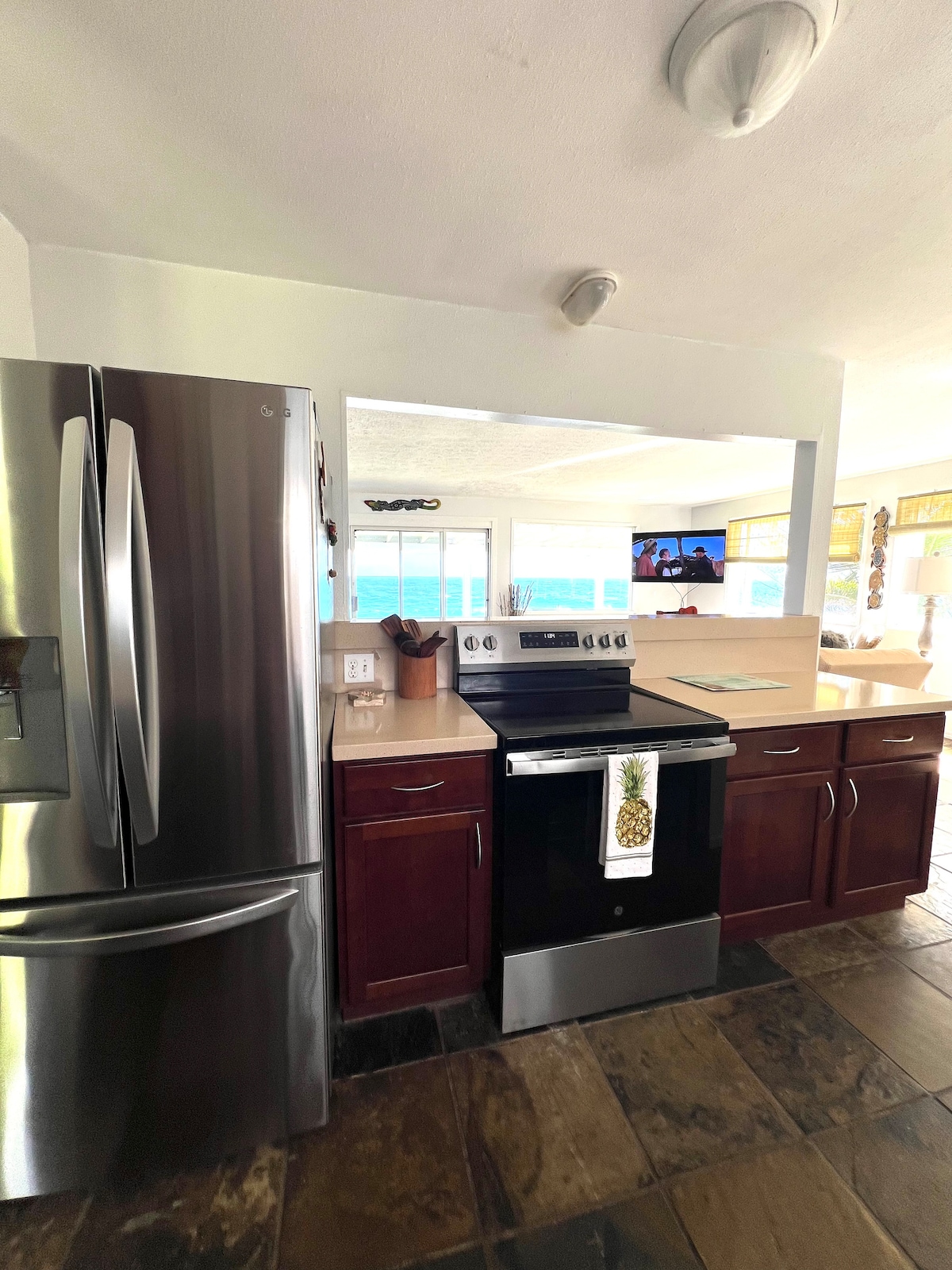 Terletak di komuniti tepi laut dengan pemandangan laut! Terbuka, cerah & berangin, siling 9 kaki tinggi, pintu 8 kaki, banyak tingkap/pintu gelangsar untuk merasai angin laut & mendengar bunyi laut pada waktu malam. Dapur cantik dengan kaunter kuarza & semua kemudahan. Meja makan untuk enam orang yang boleh menempatkan makanan & permainan/teka-teki. Bilik tamu yang selesa dengan TV skrin besar, sofa tidur queen & akses ke lanai tertutup 10'x36' untuk makan & bersantai di luar. Kedua-dua Bilik Tidur dengan katil king & MBath dengan pancuran hujan. Lokasi Hebat!