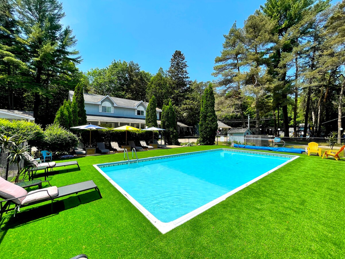 Nikmati memancing, berenang dan berkayuh 22km sungai hijau dan hitam. Paddleboat, sampan, 2 kayak dan SUP disediakan. Berjalan-jalan selama 5 minit ke bandar untuk menikmati ais krim atau hidangan bakar segar. Letakkan di dek yang ditinggikan atau di anjung yang disaring dengan buku yang bagus. Akhiri malam anda di firepit tepi sungai. Pengembaraan sehari yang berdekatan termasuk hiking, bermain golf, taman, pantai, kilang bir, kasino rama, dan ski menuruni bukit di Mount St Louis Moonstone dan Horseshoe Valley (30 minit memandu).