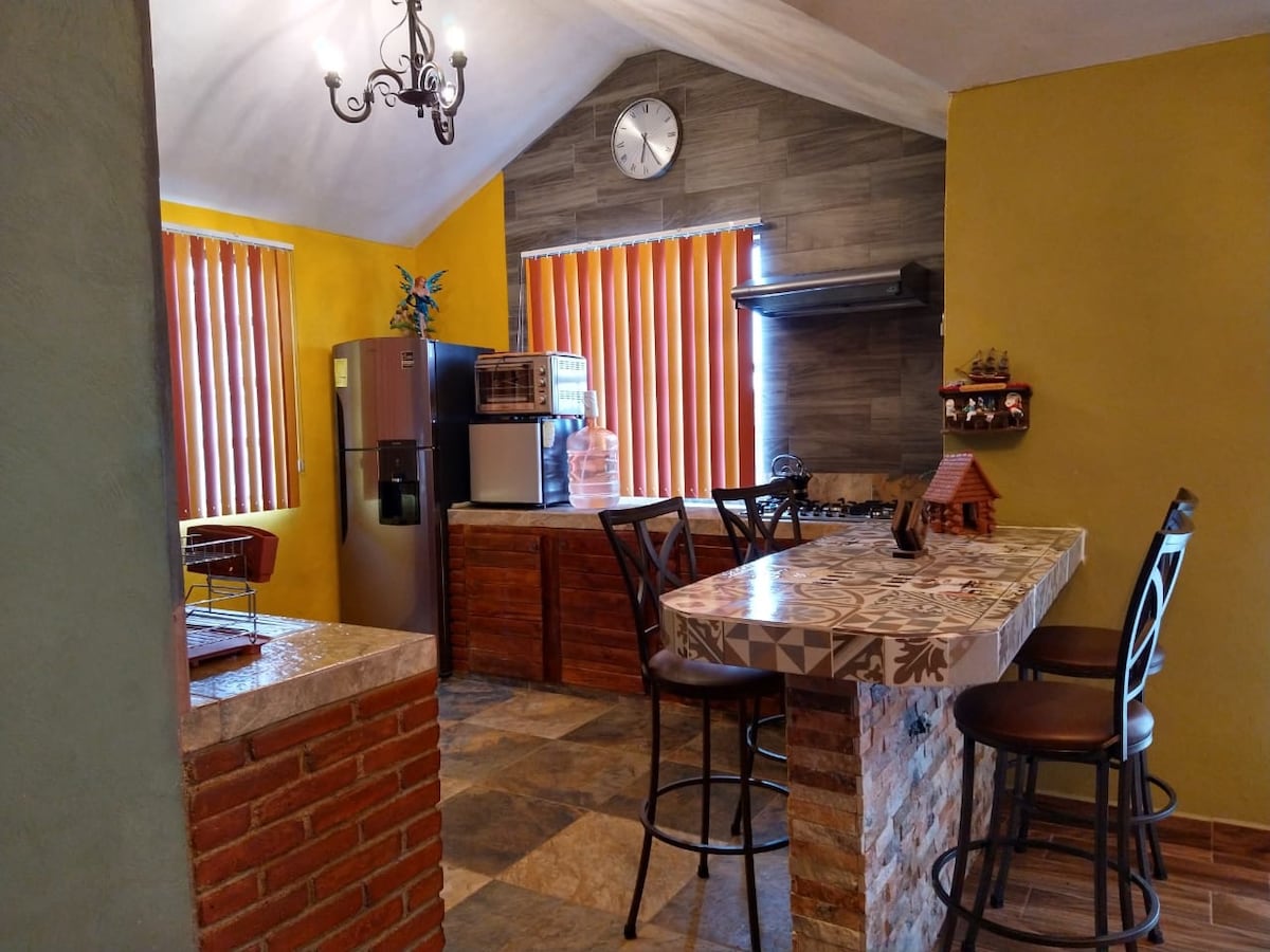 Vila desa untuk 9 orang, dibina daripada kayu dengan 135 m² selesa dan selesa, sesuai untuk keluarga, rakan-rakan atau pasangan. Dikelilingi oleh pokok ocote, oak dan seribu tumbuhan berwarna-warni, ia menawarkan 2 bilik tidur dengan peralatan tempat tidur premium, bilik mandi yang luas, dapur lengkap, ruang makan dengan pemandangan hutan dan pemanggang Weber. Kawasan selamat dengan WiFi, mesra haiwan peliharaan (kos tambahan). Anda wajib mematuhi peraturan untuk memastikan keselamatan, keharmonian dan pengalaman terbaik untuk semua.