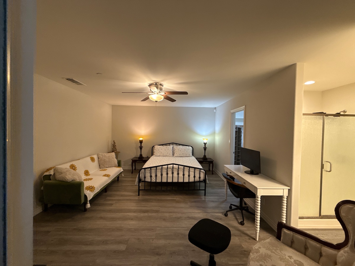 Private 1BR Guesthouse in Canyon Crest, Riverside. Completely private and centrally located, just 10 minutes from downtown Riverside and under a 10-minute walk to UCR. Walk to grocery store, pharmacy, restaurants, and shops — all within 5 minutes. Recently remodeled and clean. The guesthouse includes one full bed, wall-mounted TV, living area with sofa, kitchenette (refrigerator + microwave), on-site laundry, and one dedicated driveway parking space.