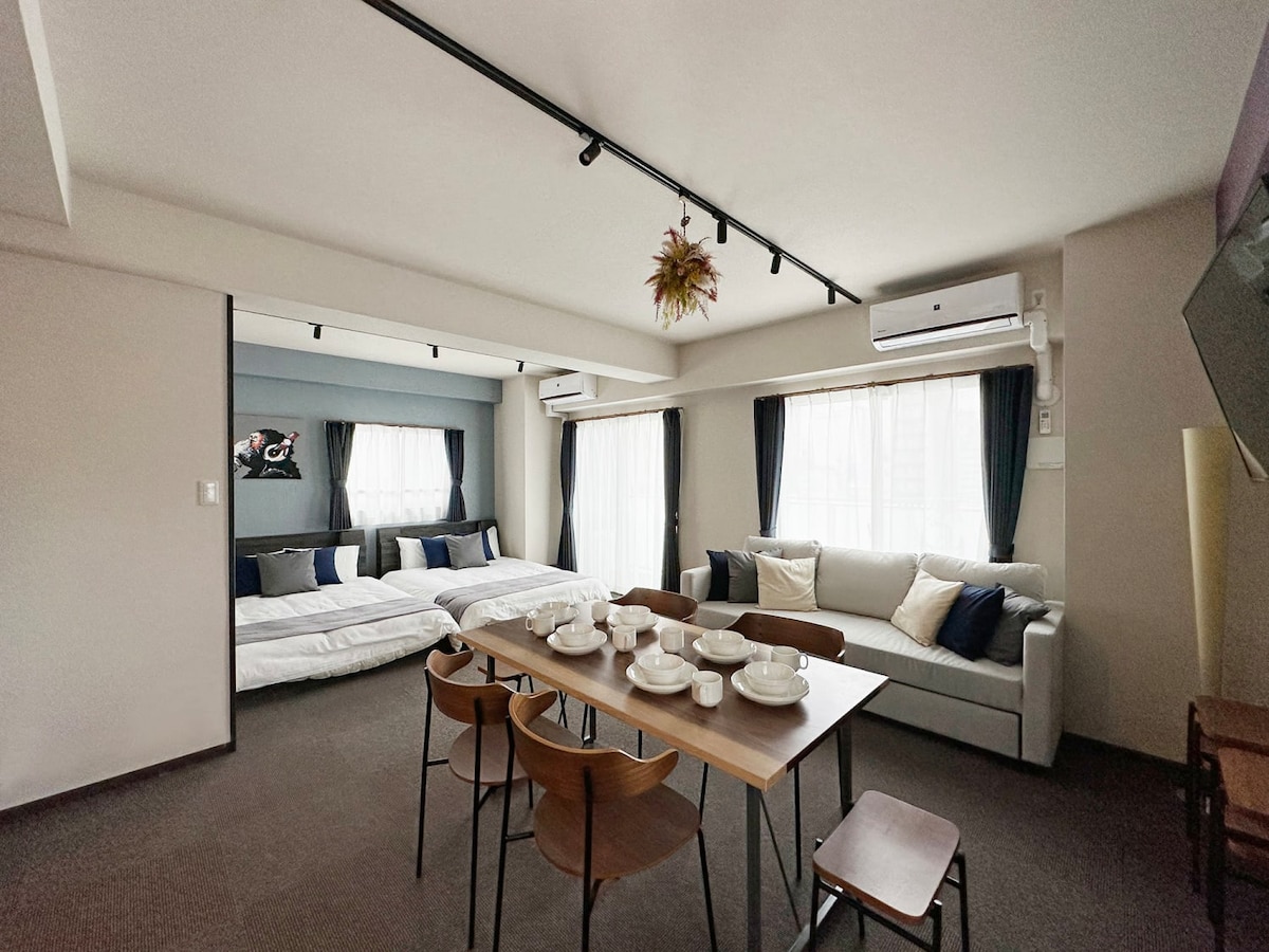 Bilik suite Maisonette terhad kepada 1 kumpulan sehari Boleh menampung sehingga 9 orang [Alphabed Hiroshima Nakamachi #402]